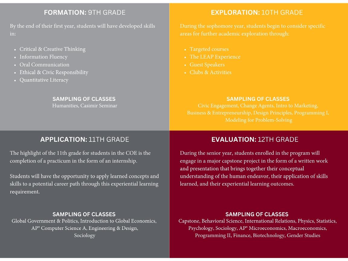 The Centers of Excellence were created with the idea of giving students the opportunity to gain more practical experience by allowing them to become globally engaged in a specific focal area while completing their traditional curricular requirements. Students enrolled in the Centers of Excellence will take a unique course of study focused on courses within the area of their chosen Center. Building off the skills obtained their freshman year, sophomores will have the option to enroll in one of four Centers—The Mark R. Russell ’67 Center for Business and Entrepreneurship, the Center for Health Science, the Center for Social Justice, and the Center for Innovation. The Center for Innovation may focus on one of two areas: Computer Science or Engineering. In their junior year, students will enroll in Practicum Seminar, which is to be completed in the form of a supervised practicum or virtual externship. Senior year, students will complete a capstone project within the English Department and will also attend a recognition ceremony before graduation.