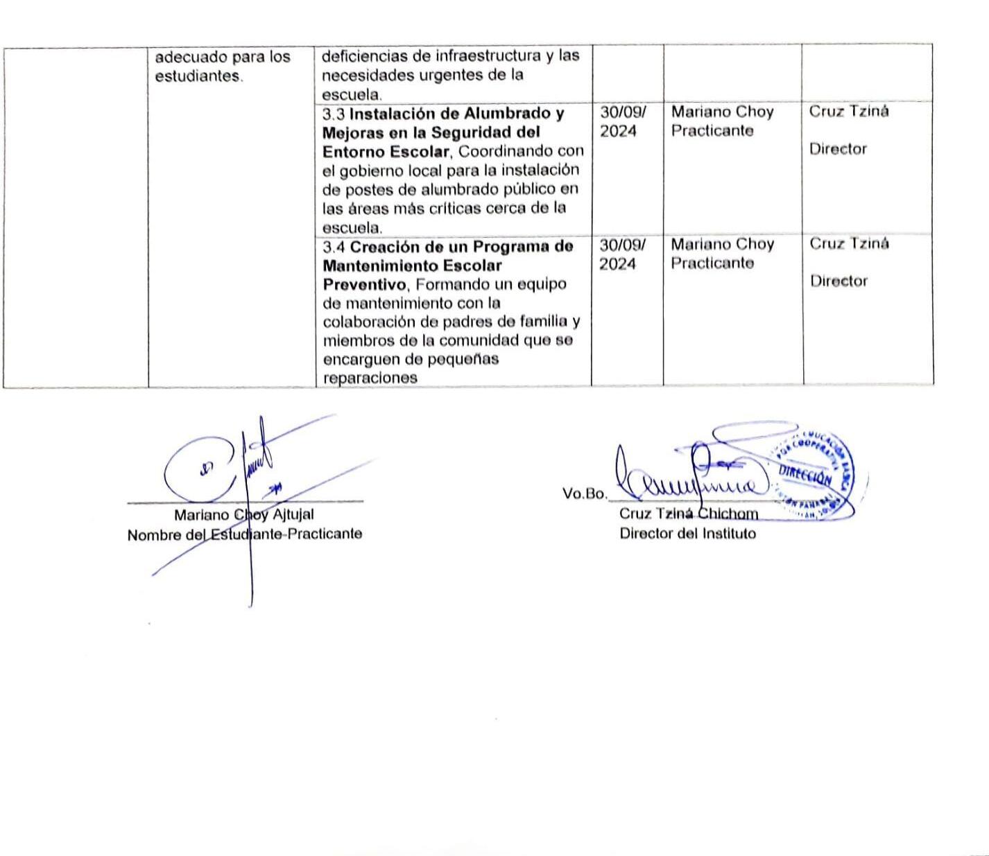 Acciones:Gestionarlainstalacióndealumbradopúblicoymejorasenlaseguridadalrededor del centro educativo mediante el trabajo colaborativo con la comunidad y autoridades locales. Al mismo tiempo, buscar fondos o apoyo comunitario para realizar pequeñas mejoras en el edificio, como la construcción de más sanitarios y mejoras en las aulas. Resultado esperado: Creación de un entorno más seguro y atractivo que mejore la percepción del centro educativo frente a la competencia yofrezca mejores condiciones para los estudiantes.