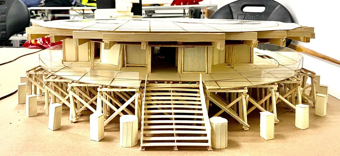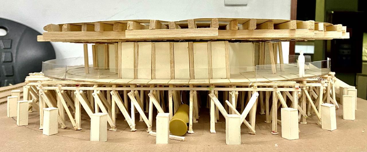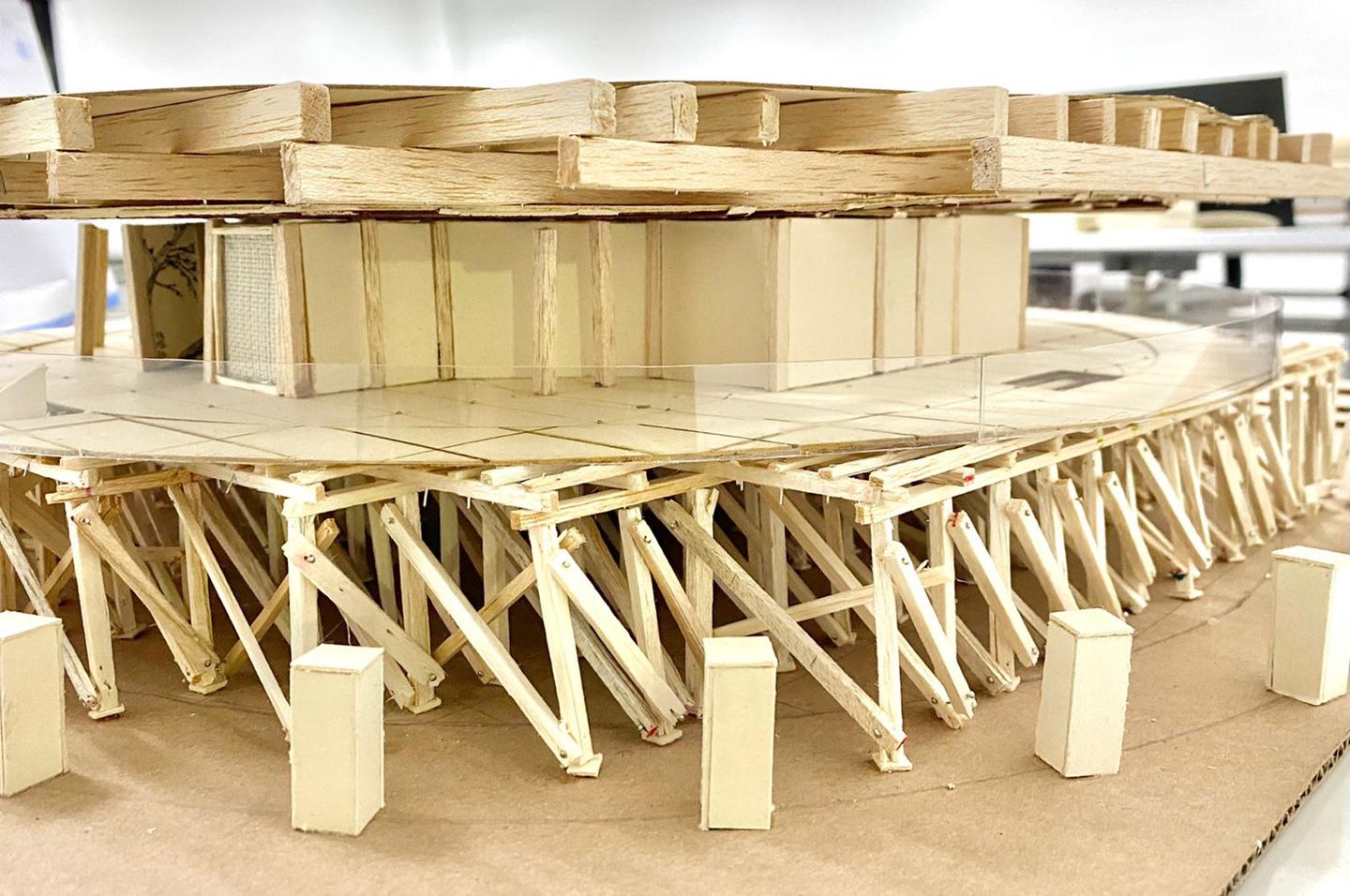 Se utilizó arquitectura efimera, en este caso el modelo tridimensional se realizó con madera balsa. Con ella representamos vigas, polines, largueros, contraventeos y patas de gallo. Todo esto conforma una cimbra y está tiene como fianlidad sostener las partes de el entrepiso y el techo de arriba. Además de que los elementos estructurales están por dentro y por fuera de la casa de té.