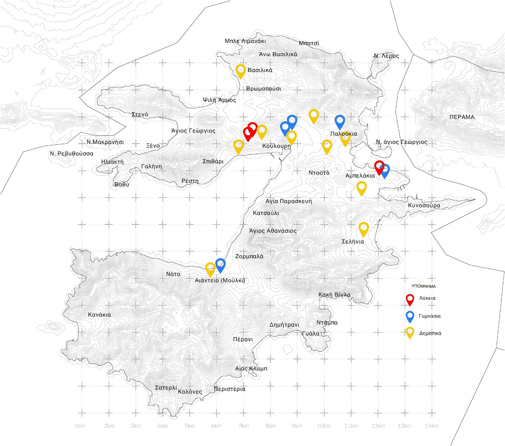Χάρτης συγκέντρωσης σχολείων Εξέλιξη πρωτογενούς τομέα εργασίας στους οικισμούς. Εξέλιξη τριτογενούς τομέα εργασίας στους οικισμούς. Πολεοδομικό κέντρο του Δήμου ορίζεται η Κούλουρη και ταυτόχρονα χωροθετούνται κάποια τοπικά κέντρα γειτονιάς σε κάθε οικισμό, χωρίς όμως να λειτουργούν στην πραγματικότητα ως κέντρα εξυπηρέτησης και αυτόνομης λειτουργίας, διότι υπάρχουν σχέσεις εξάρτησης μεταξύ των οικισμών. Συγκεκριμένα, σύμφωνα με τις συνεντεύξεις το πλησιέστερο φαρμακείο από τη Γιάλα βρίσκεται στο Αιάντειο, ενώ για τις βασικές ανάγκες σε τρόφιμα εξυπηρετούν δύο φούρνοι στη λεωφόρο της Κακή Βίγλας. Φαίνεται, λοιπόν, η ανάγκη του κάθε οικισμού από τον άλλο, μη επιτρέποντας του να αναπτυχθεί σε πιο αυτόνομο οικισμό, που θα μπορεί να εξυπηρετεί με άνεση το μόνιμο πληθυσμό, που τον συγκροτεί. Καθώς διαπιστώθηκε, ήδη, ότι οι περισσότερες υπηρεσίες του νησιού συγκεντρώνονται στην Κούλουρη, ο χάρτης κατανομής των σχολείων παρουσιάζει το ίδιο φαινόμενο συγκεντρωτισμού. Τα περισσότερα βρίσκονται στο βόρειο τμήμα της Σαλαμίνας, κυρίως στα Παλούκια και στην Κούλουρη. Στο πλαίσιο των μετασχηματισμών που προκαλεί η άυξηση του μόνιμου πληθυσμού είναι και η αναδιαμόρφωση των κυρίαρχων επαγγελματικών δραστηριοτήτων στην έκταση του νησιού. Συγκεκριμένα, η αγροτική ανάπτυξη έχει περιοριστεί εις βάρος της αστικής εξάπλωσης και της ανάπτυξης του τριτογενούς τομέα. Εφόσον, ο πληθυσός αυξάνεται η ανάγκη για περισσότερες υπηρεσίες και περισσότερη έκταση γίνεται προτεραιότητα. Επομένως, απο τα χαρτογραφικά δεδομένα παρατηρείται η μείωση της απασχόλησης στη γεωργία, την κτηνοτροφία και την αλιεία. Μάλιστα, σύμφωνα