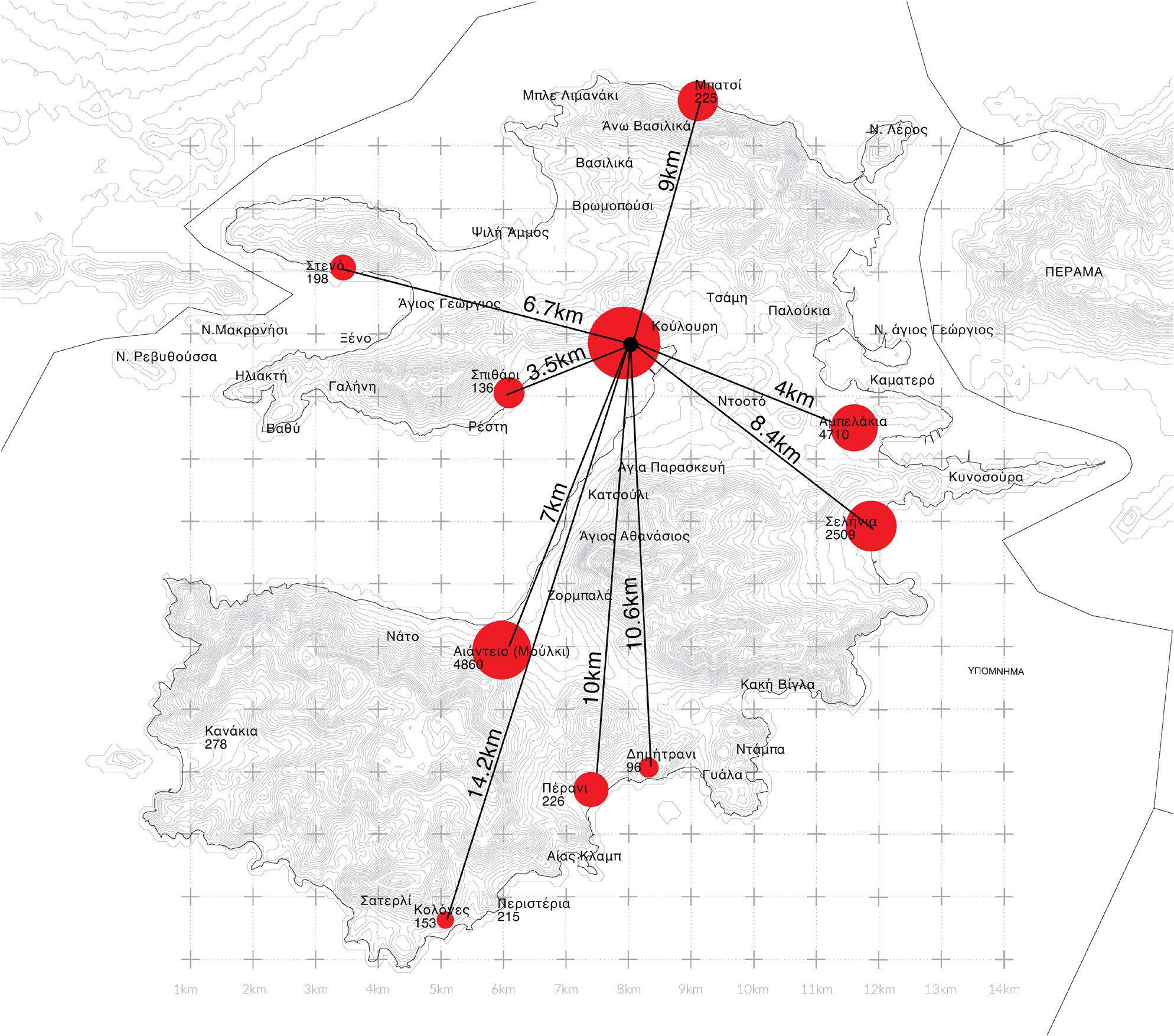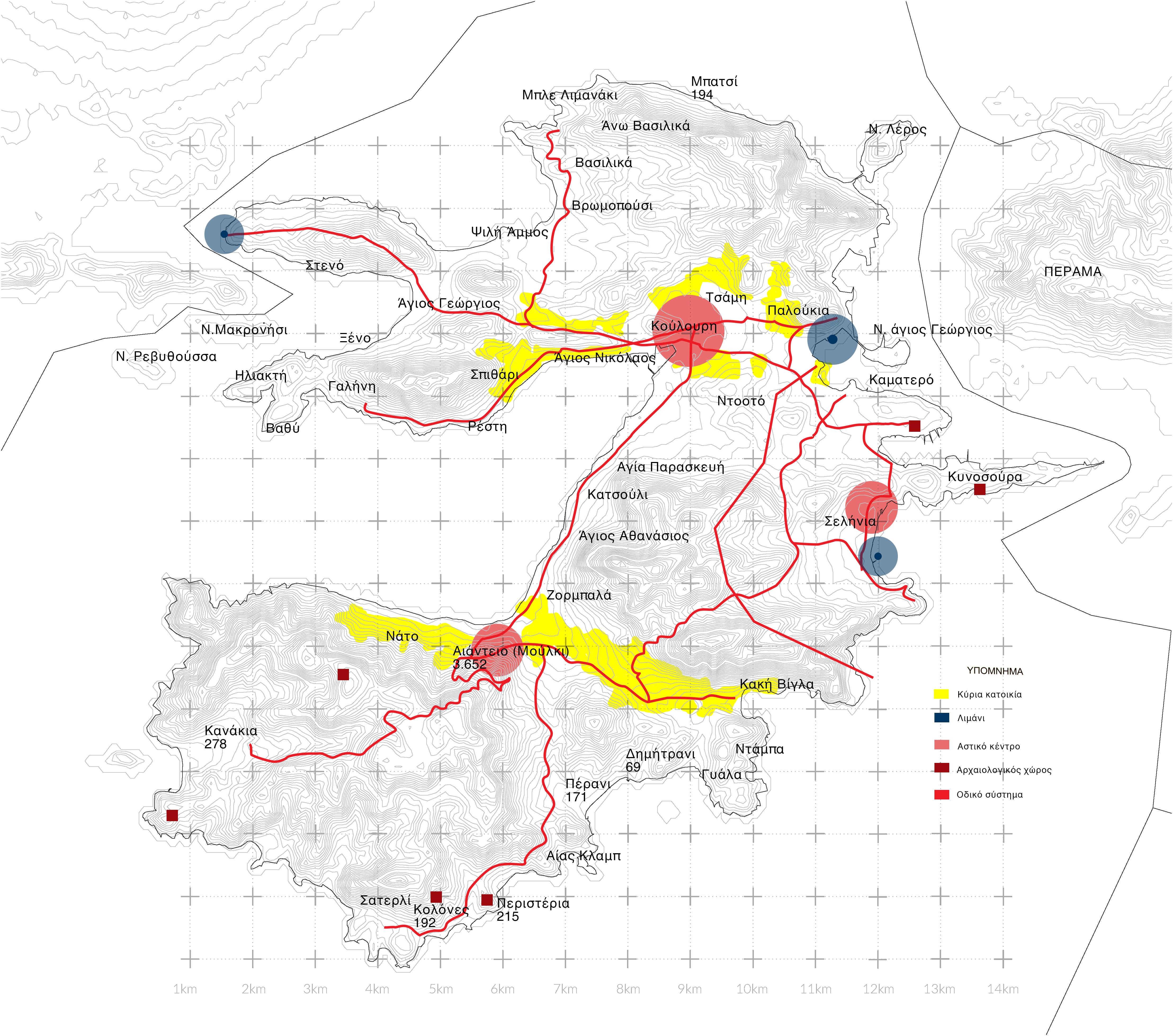 στο παράκτιο μέτωπο (Κολώνες, Περιστέρια, Πέρανι) και η δασική έκταση της υπόλοιπης περιοχής δεν έχει οικοδομηθεί. Ωστόσο, σε περιοχές που επιτρέπεται η ανάπτυξη, αυτό έχει γίνει, όπως για παράδειγμα στον άξονα Αιαντείου - Κακής Βίγλας. Σημαντικό στοιχείο για τη μελέτη της δυναμικότητας των οικισμών και την κατανόηση της συγκέντρωσης του μόνιμου πληθυσμού αποτελούν οι χρονοαποστάσεις και οι υποδομές του οδικού δικτύου. Περιοχές , όπως τα Σελήνια και το Αιάντειο, τα οποία βρίσκονται σε κοντινή απόσταση από την Κούλουρη και ο δρόμος είναι πιο ομαλός έχουν αποκτήσει μεγαλύτερη εμβέλεια επιρροής στο νησί για την εγκατάσταση μόνιμου πληθυσμού. Ενώ για παράδειγμα, οι νότιοι οικισμοί, που είναι πιο δυσπρόσιτοι, δεν έχουν αναπτυχθεί ομοίως. Οι ίδιες οι υποδομές, δεν επιτρέπουν τη διευκόλυνση της μετακίνησης, καθώς οι δρόμοι βρίσκονται σε μια μέτρια προς κακή κατάσταση, ενώ η έλλειψη σήμανσης και φαναριών οδηγεί σε πολλά τροχαία ατυχήματα στο νησί. Επομένως, η ισόνομη κατανομή του πληθυσμού στο νησί δεν επιτυγχάνεται καθώς, οι περιοχές δεν αναπτύσσονται παράλληλα, υπάρχει ο κίνδυνος αποκοπής τους από το σύνολο και εντείνεται η εξάρτηση από το κέντρο. Η ίδια, η συγκοινωνία, μάλιστα, αναβαθμίστηκε πρόσφατα, το 2021, ενώ τα προηγούμενα έτη δυσκόλευε πολύ την μετακίνηση από τον έναν οικισμό στον άλλο, λόγω των περιορισμένων δρομολογίων. Διακύμανση του αναγλύφου του νησιού Δασικές εκτάσεις Ανάπτυξη των οικισμών με βάση το ανάγλυφο και τη δασική έκταση
