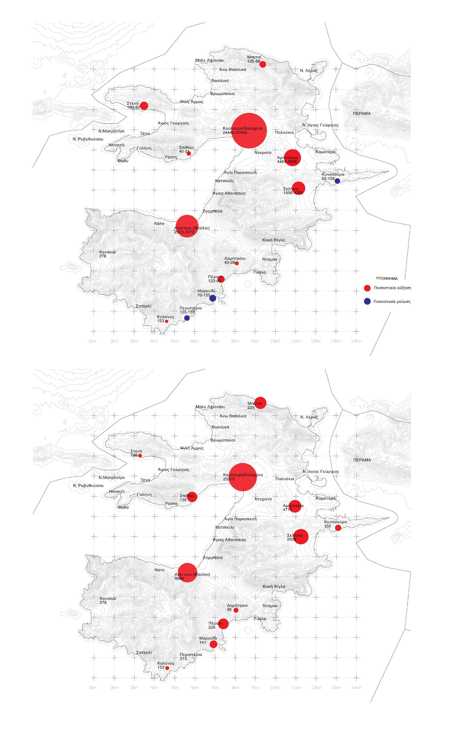 και μετασχηματισμούς στις χρήσεις γης. Παρατηρείται από το corine πως έχουν εξελιχθεί οι καλύψεις γης από το 2000 μέχρι το 2018. Η σημαντικότερη οικιστική εξάπλωση είναι αυτή στον άξονα της Κακής Βίγλας, όπως έχει προαναφερθεί. Παρατηρείται παράλληλα, η αλλαγή της αγροτικής γης σε οικιστική, κυρίως στα έτη 2000 και 2006, όπου αλλάζει μεγάλη έκταση στη βόρεια πλευρά του νησιού και στους οικισμούς Κακής Βίγλας, Λιμιώνα και Αιαντείου. Σύμφωνα και με το ΓΠΣ του 2010, οι νότιοι οικισμοί (Λιμιώνας, Περιστέρια, Κολώνες, Πέρανι) εντάσσονται σε περιοχές παραθεριστικής κατοικίας, ενώ η περιοχή της Κακή Βίγλας, η οποία διαμορφώθηκε έπειτα, σε μόνιμη. Αυτό είναι χαρακτηριστικό παράδειγμα διαχείρισης της αύξησης του μόνιμου πληθυσμού στο νησί, διότι περιορίστηκε η αγροτική έκταση που προϋπήρχε στο νησί, αναπτύχθηκε ο οικισμός εσωτερικά του νησιού και όχι σε παράκτια ζώνη, διευκολύνοντας την επέκταση του και ορίστηκε μέσα σε λίγα χρόνια περιοχή μόνιμης κατοικίας.