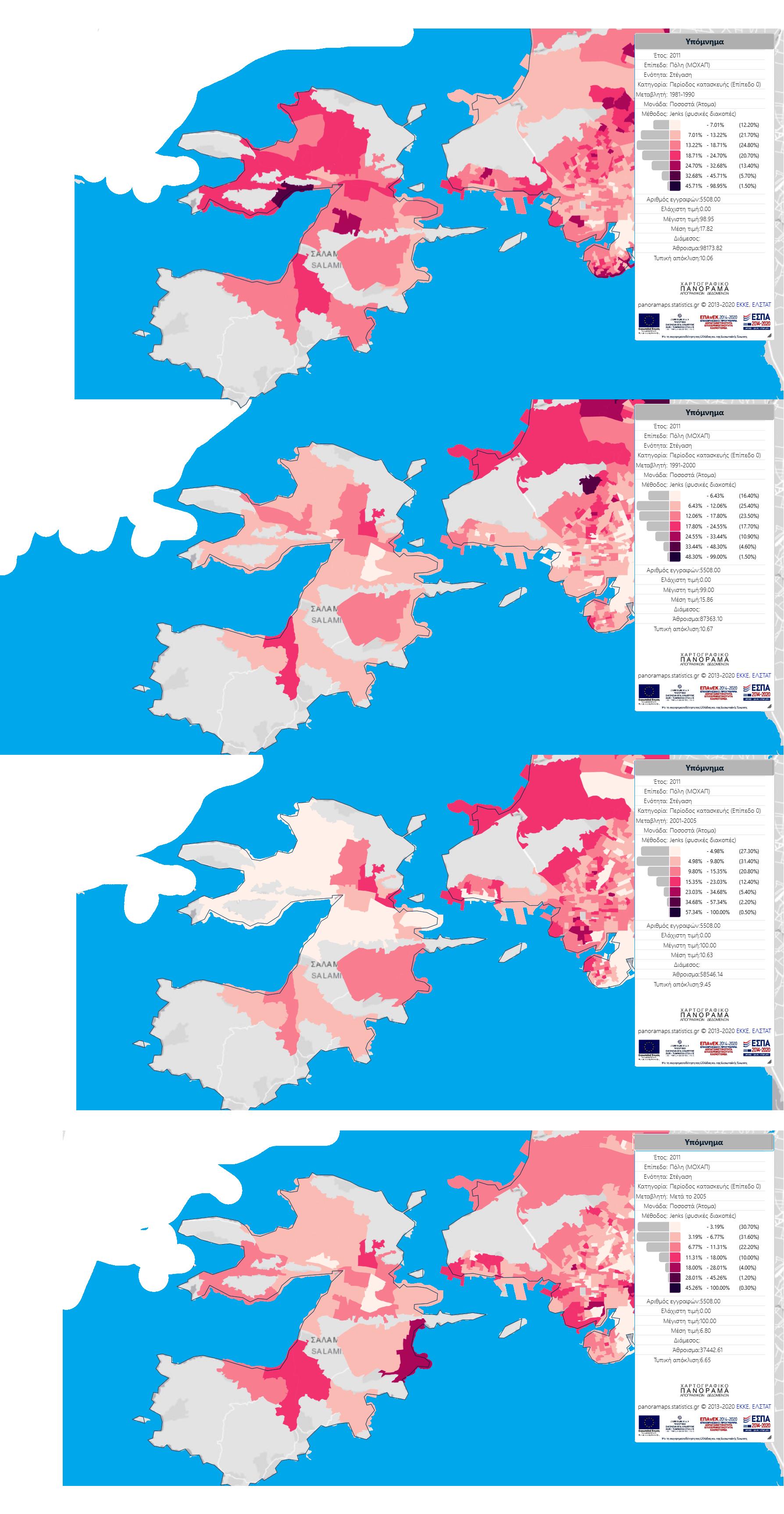 ΣΥΝΘΗΚΕΣ ΔΟΜΗΣΗΣ ΠΛΗΘΥΣΜΙΑΚΑ ΔΕΔΟΜΕΝΑ ΚΑΙ ΚΑΤΑΝΟΜΗ ΣΤΟΥΣ ΟΙΚΙΣΜΟΥΣ την εξάπλωση των κατοικιών στη χρονική διάρκεια 20 χρόνων. Το 1981 καταγράφονται κατοικίες κεντρικά, προς τον Άγιο Νικόλαο και τα Παλούκια, ενώ σημαντική ανοικοδόμηση φαίνεται να καταγράφεται από το 2005 και έπειτα στα Σελήνια, καθώς και σύμφωνα με την ΕΛΣΤΑΤ από το 2001 μέχρι και το 2011 τα Σελήνια αποκτούν σημαντική αύξηση μόνιμου πληθυσμού (553 νέοι κάτοικοι). Παρόμοια εξέλιξη αποκτούν και οι περιοχές του Αιαντείου και Νάτου, καθώς ο μόνιμος πληθυσμός αυξάνεται κατά 1887 κατοίκους από το 2001 στο 2011, ενώ τα περισσότερα κτίρια είναι κατασκευασμένα από το 2005 και έπειτα. Η εξέλιξη αυτή των οικισμών συμβαδίζει με τη γεωμορφολογία του νησιού, που θα αναλυθεί στη συνέχεια, αλλά έρχονται και σε συσχέτιση με τη διαχείριση του κέντρου του νησιού και τις συνέπειες που επιφέρει η συνθήκη της Σαλαμίνας ως εξωαστικός χώρος της Αθήνας, που αναλύθηκε στο προηγούμενο μέρος. ΕΠΙΧΕΙΡΗΣΙΑΚΟ ΠΡΟΓΡΑΜΜΑ ΔΗΜΟΥ ΣΑΛΑΜΙΝΑΣ 2011-2014, ΠΕΡΙΦΕΡΕΙΑΚΗ ΕΝΟΤΗΤΑ ΝΗΣΩΝ ΔΗΜΟΣ ΣΑΛΑΜΙΝΑΣ https://www.statistics.gr, ΕΛΛΗΝΙΚΗ ΣΤΑΤΙΣΤΙΚΗ ΑΡΧΗ Υλικό από τις συνεντεύξεις https://panorama.statistics.gr,