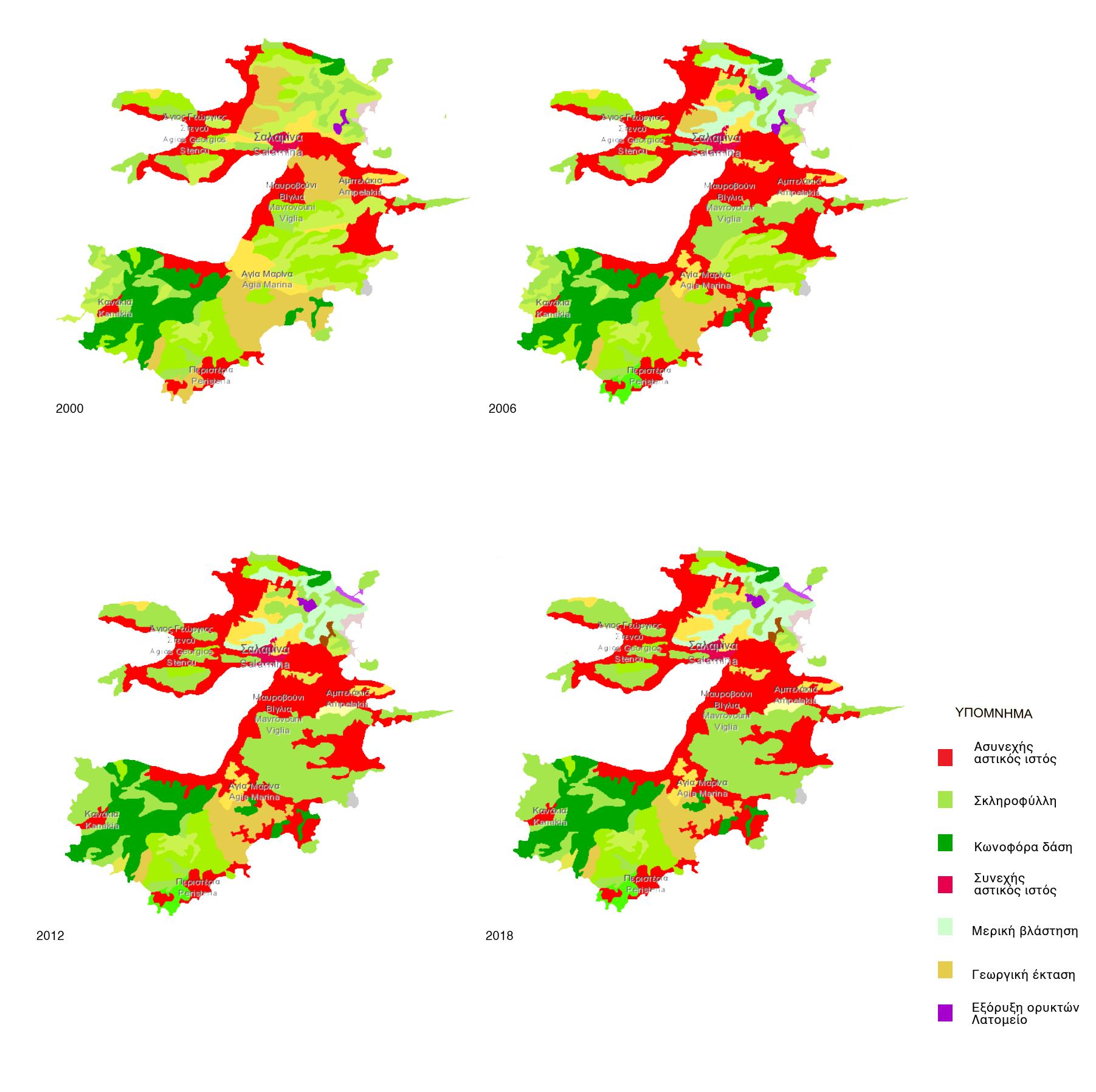 ΧΡΗΣΕΙΣ ΓΗΣ ΚΑΙ ΥΠΟΔΟΜΕΣ Εξάπλωση του αστικού ιστού από το 2000 μέχρι το 2018 Γενικό Πολεοδομικό Σχέδιο 2010 https://thesalaminians.wordpress.com/, Γενικό Πολεοδομικό Σχέδιο https://land.copernicus.eu/pan-european/corine-land-cover Η εξάπλωση των οικισμών στη Σαλαμίνα και η μετάβαση από έναν παραθεριστικό τόπο σε τόπο μόνιμης κατοικίας επιφέρει αλλαγές