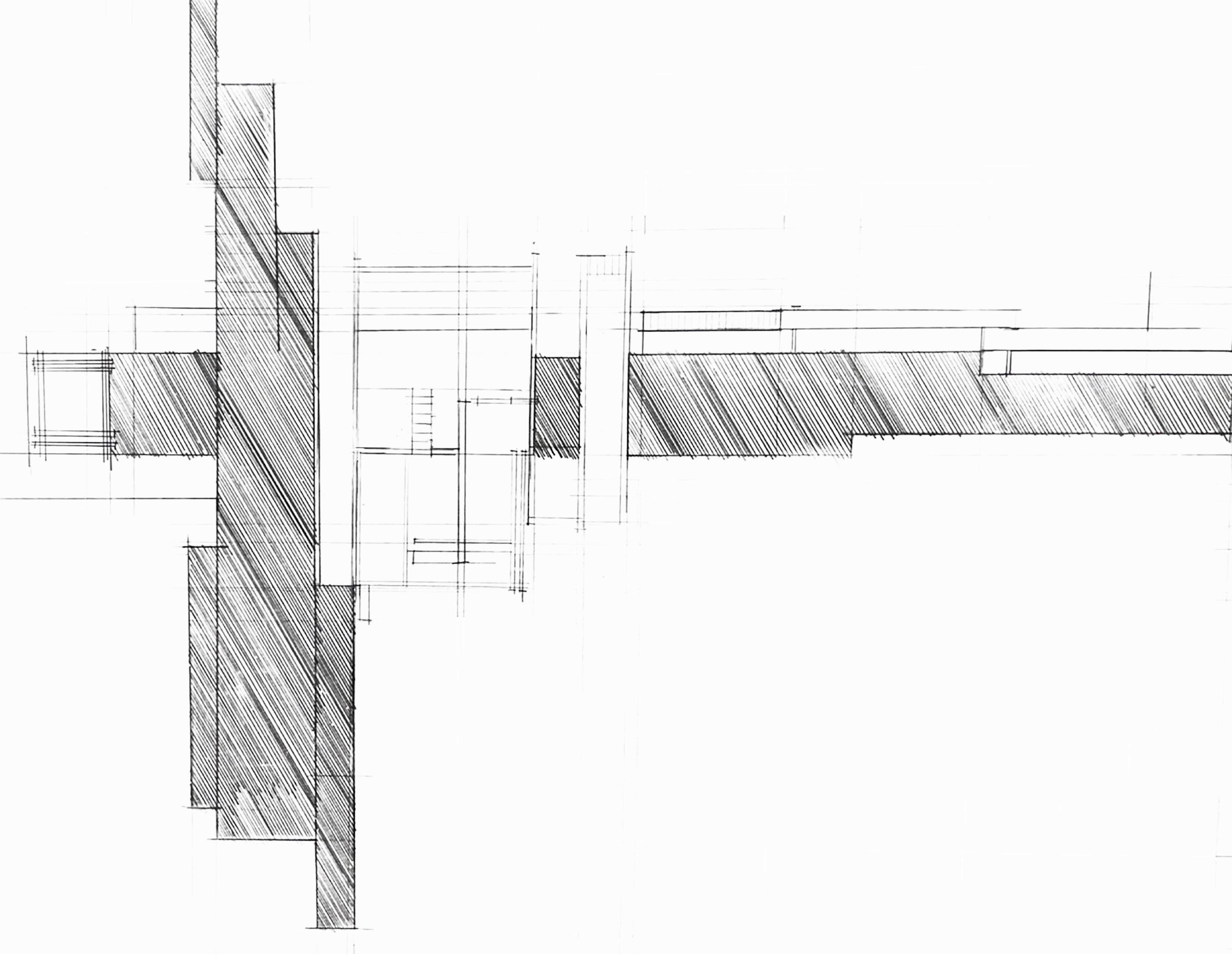 THREE SECTIONS FROM ONE OF THE MODELS CONNECTED WITH HATCHINGS. THE HATCHED DATUM HIGHLIGHTS IMPORTANT SPACES FROM THE MODEL.