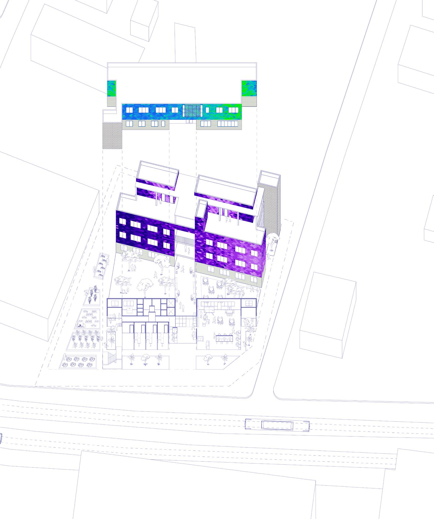 This project focuses on providing young LGBT homeless adults, ages 18-24 with transitional housing, promoting a sense of community and belonging through the incorporation of interior shared spaces on each floor, and a central courtyard, engaging both interior and exterior spaces.