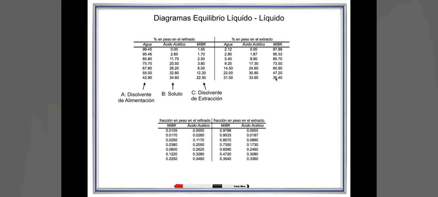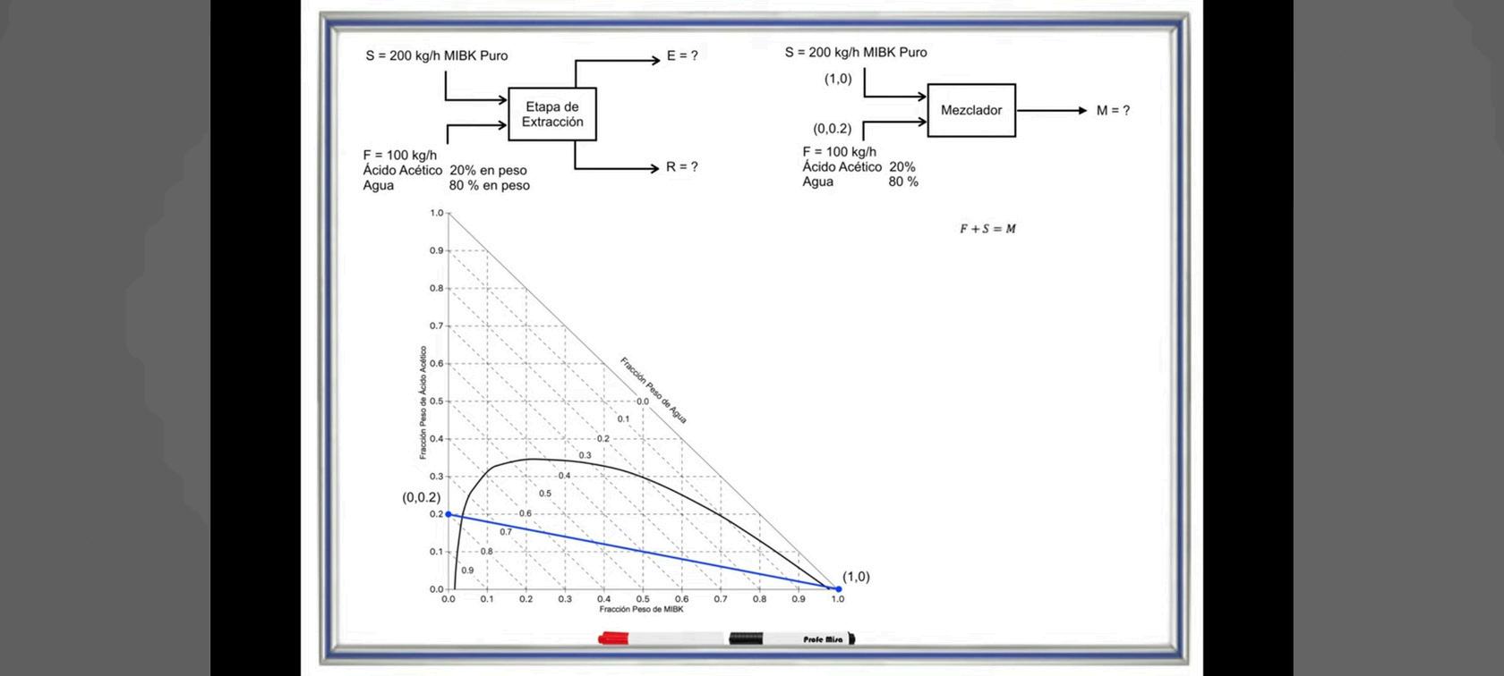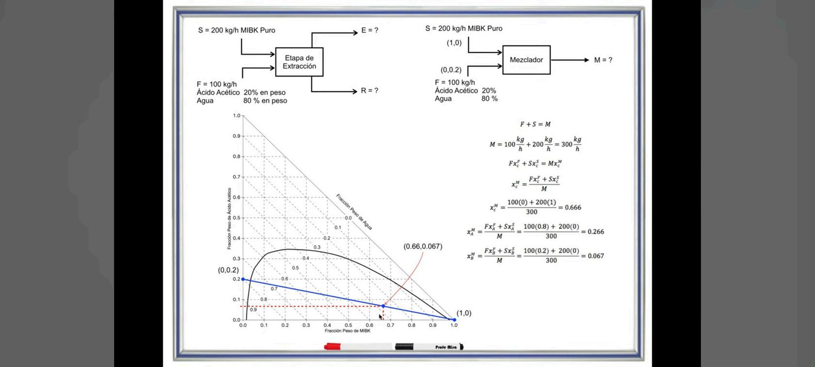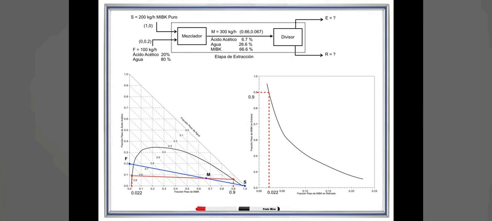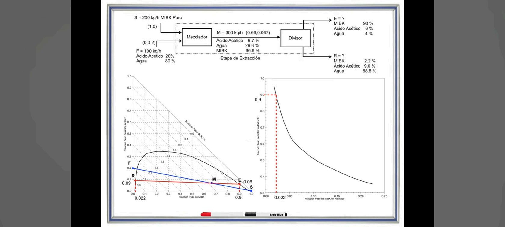 Una harina que contiene aceite ha de extraerse con un disolvente, constituido mayormente por benceno, operando en un sistema de extracción en flujo cruzado en dos etapas.Al sistema de extracción se hace ingresar 100 kg/h de alimentación, que contiene 40 % peso de. aceite, y un disolvente que contiene 98 % peso de benceno y 2 % peso de aceite,utilizándose 40 kg/h y 20 kg/h respectivamente en cada etapa de extracción.