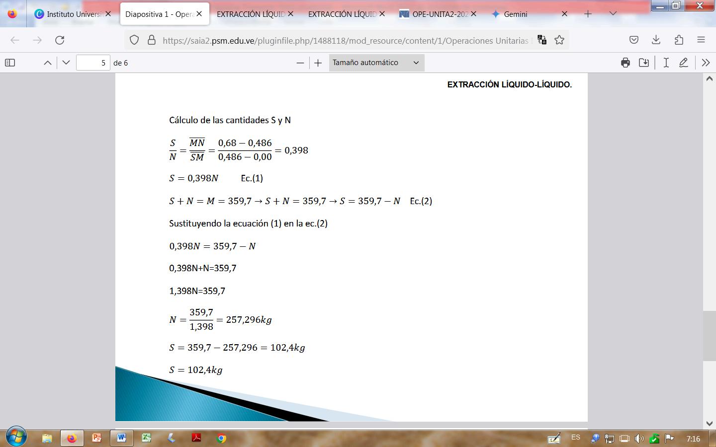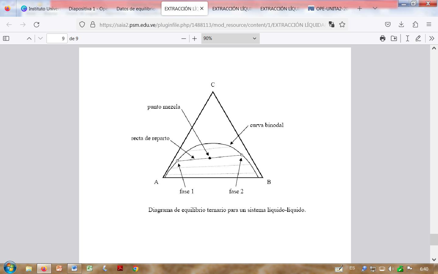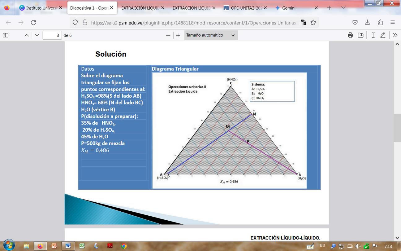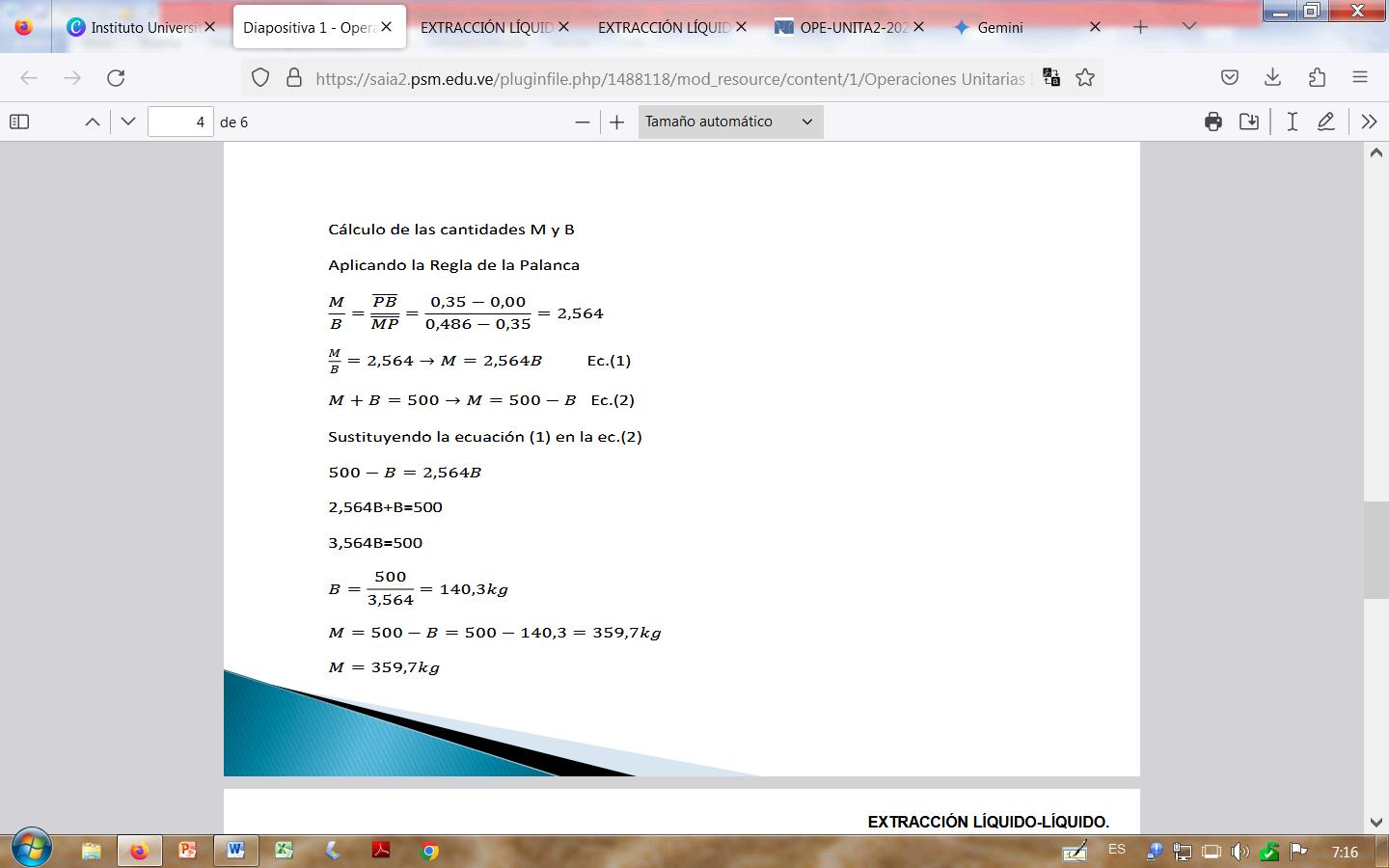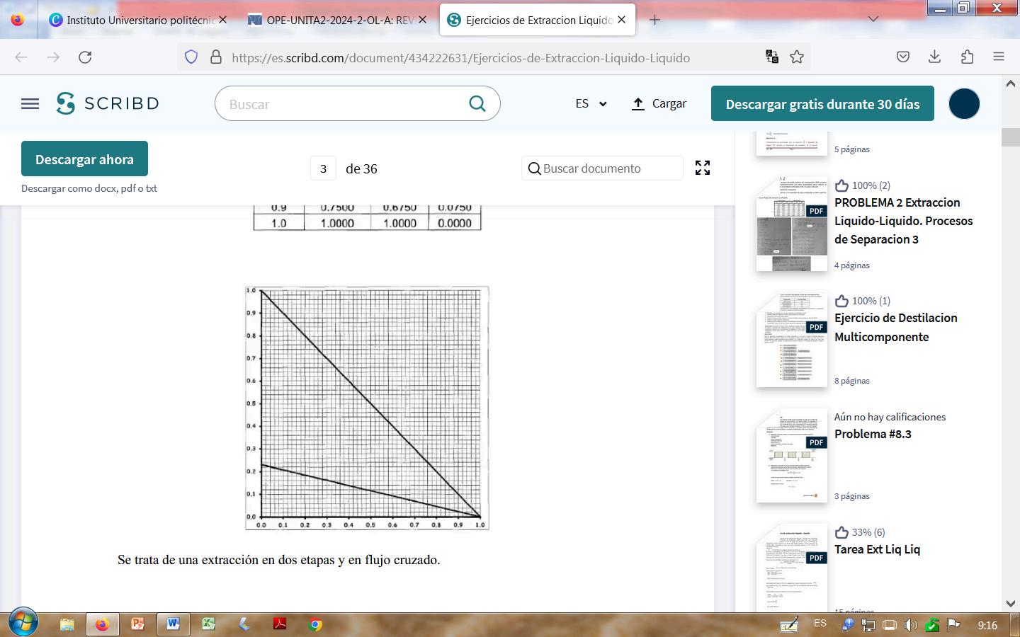 Una harina que contiene aceite ha de extraerse con un disolvente, constituido mayormente por benceno, operando en un sistema de extracción en flujo cruzado en dos etapas.Al sistema de extracción se hace ingresar 100 kg/h de alimentación, que contiene 40 % peso de. aceite, y un disolvente que contiene 98 % peso de benceno y 2 % peso de aceite,utilizándose 40 kg/h y 20 kg/h respectivamente en cada etapa de extracción.