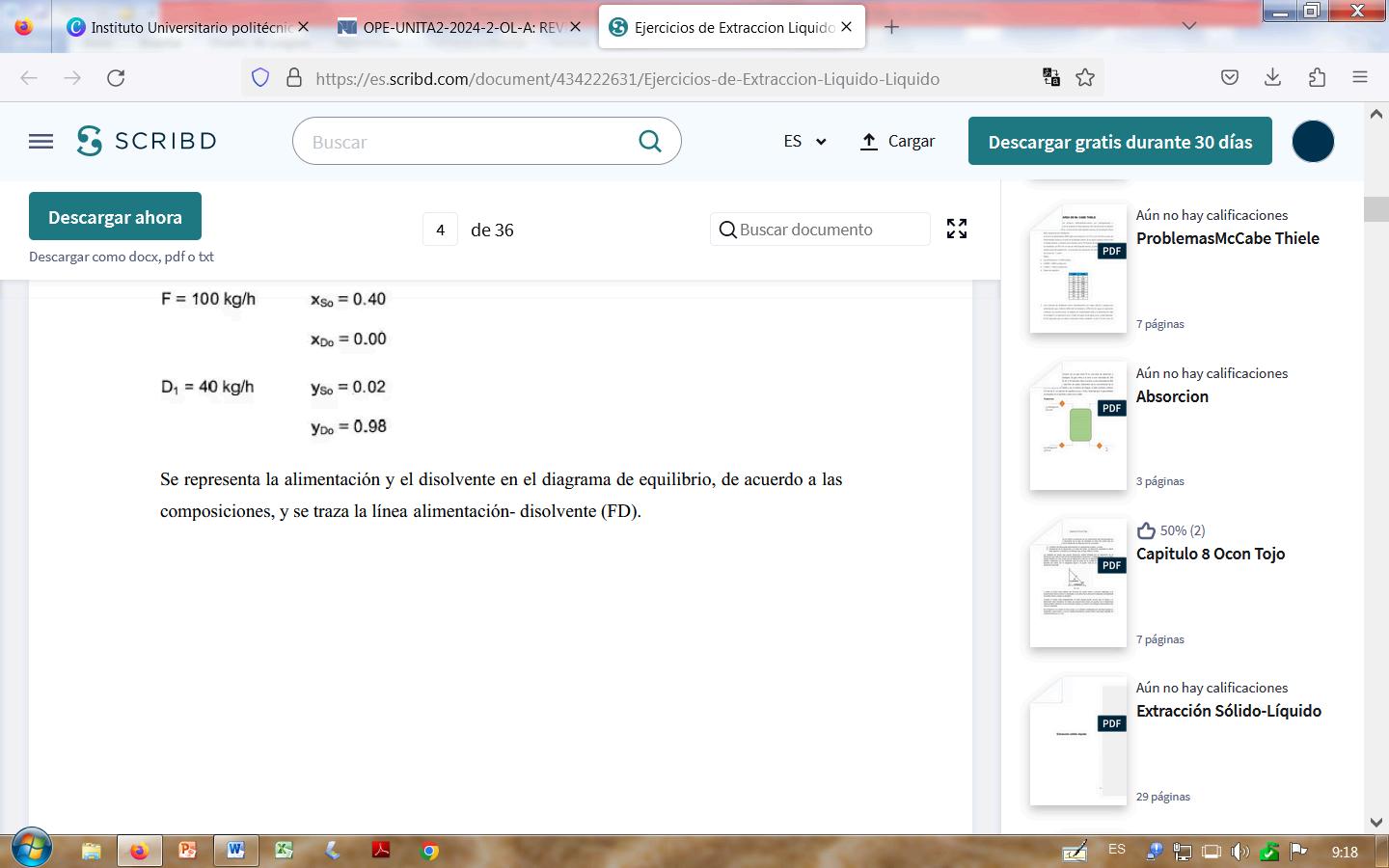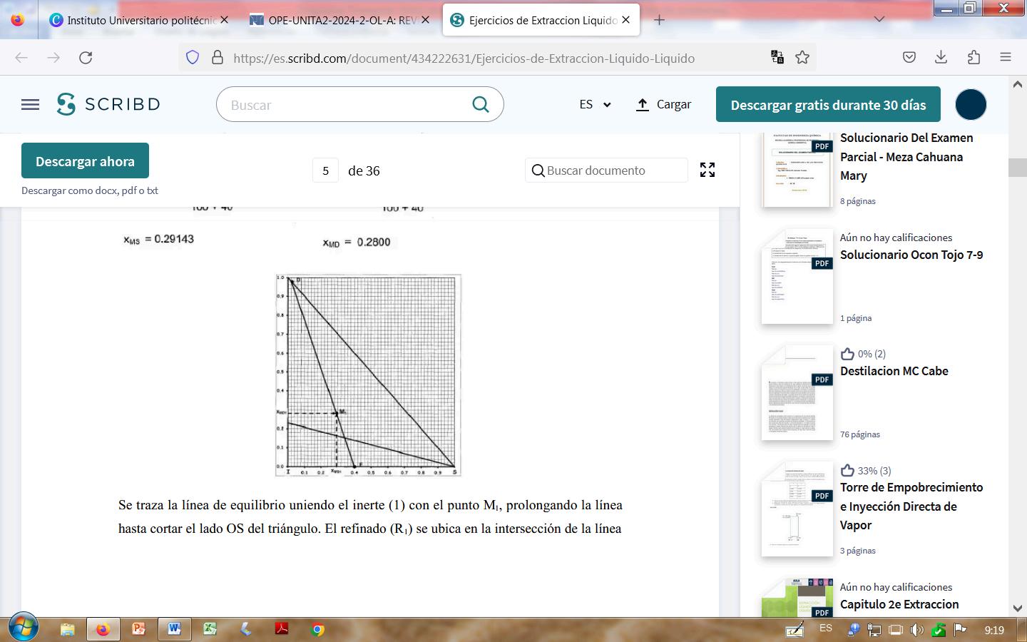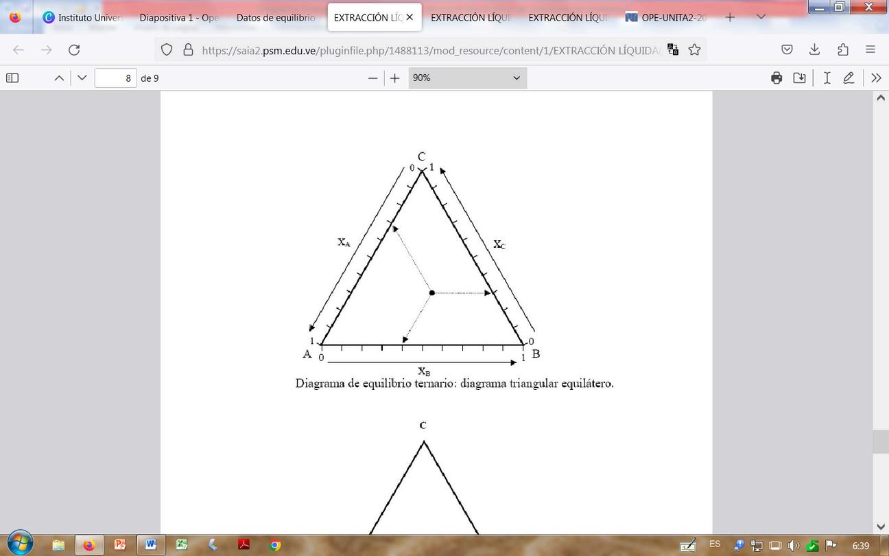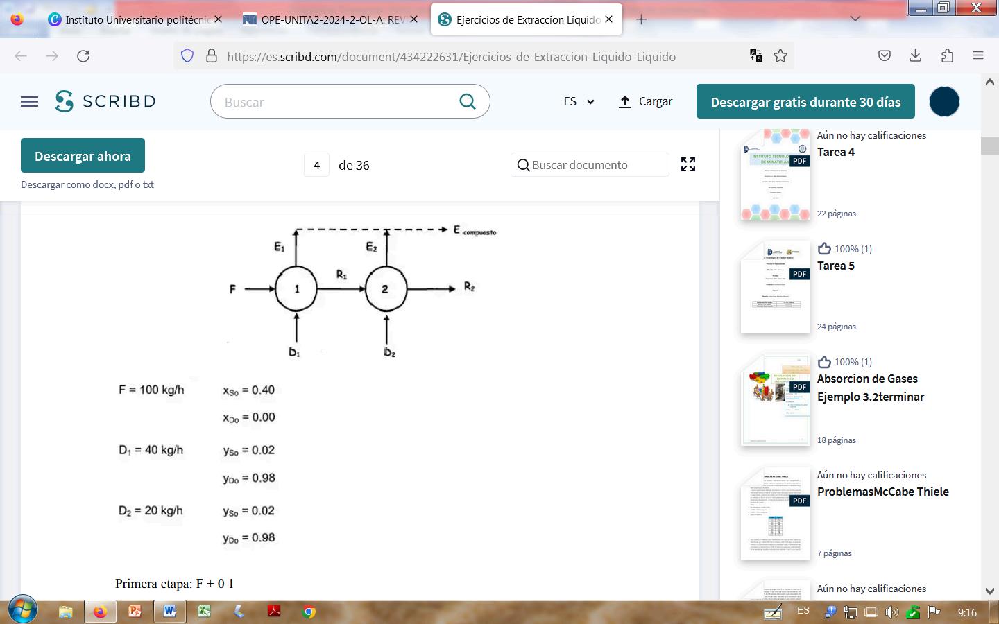 Una harina que contiene aceite ha de extraerse con un disolvente, constituido mayormente por benceno, operando en un sistema de extracción en flujo cruzado en dos etapas.Al sistema de extracción se hace ingresar 100 kg/h de alimentación, que contiene 40 % peso de. aceite, y un disolvente que contiene 98 % peso de benceno y 2 % peso de aceite,utilizándose 40 kg/h y 20 kg/h respectivamente en cada etapa de extracción.