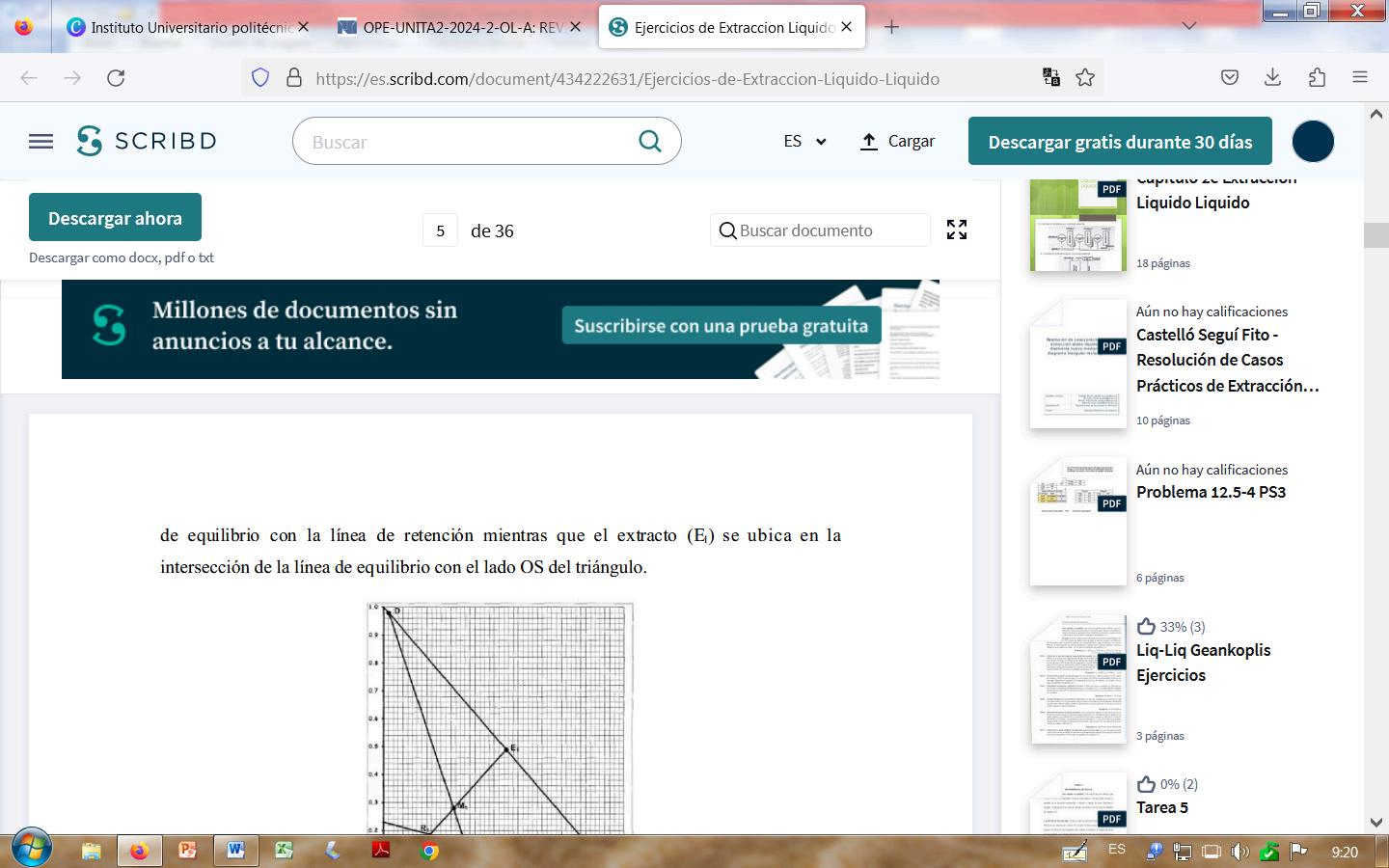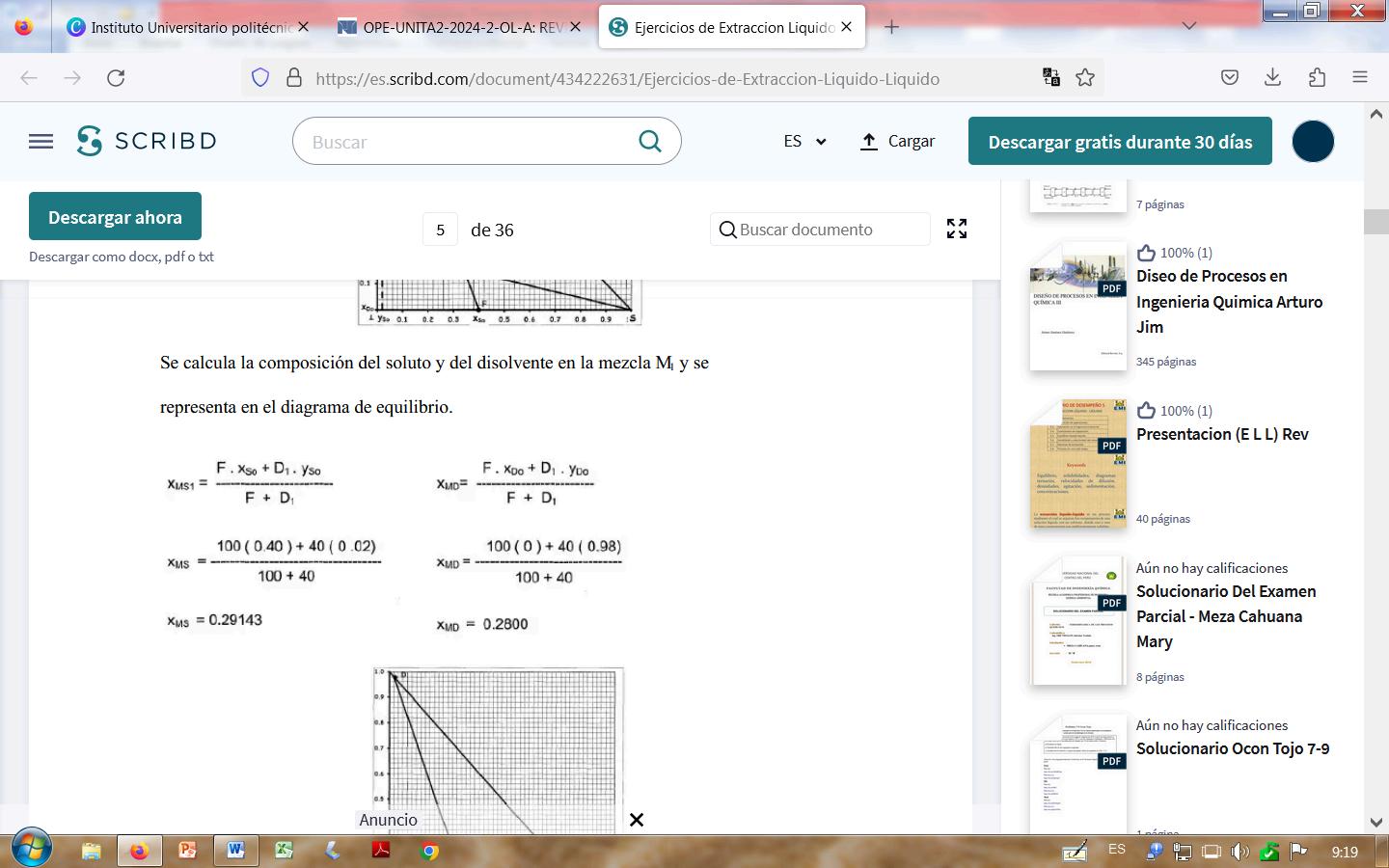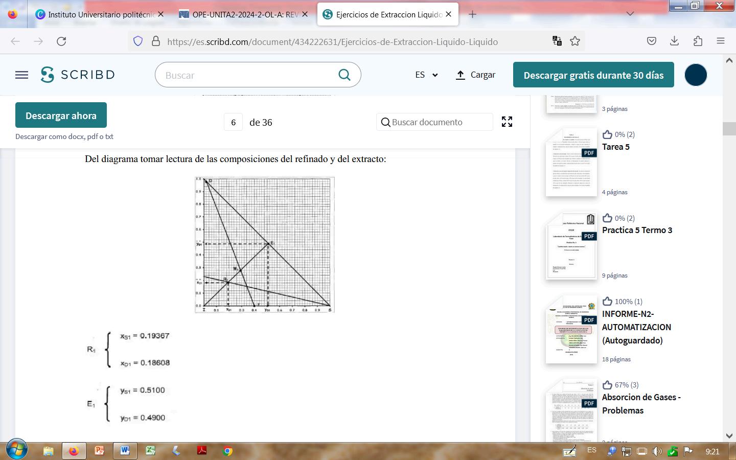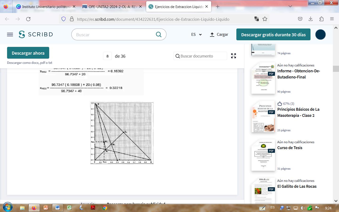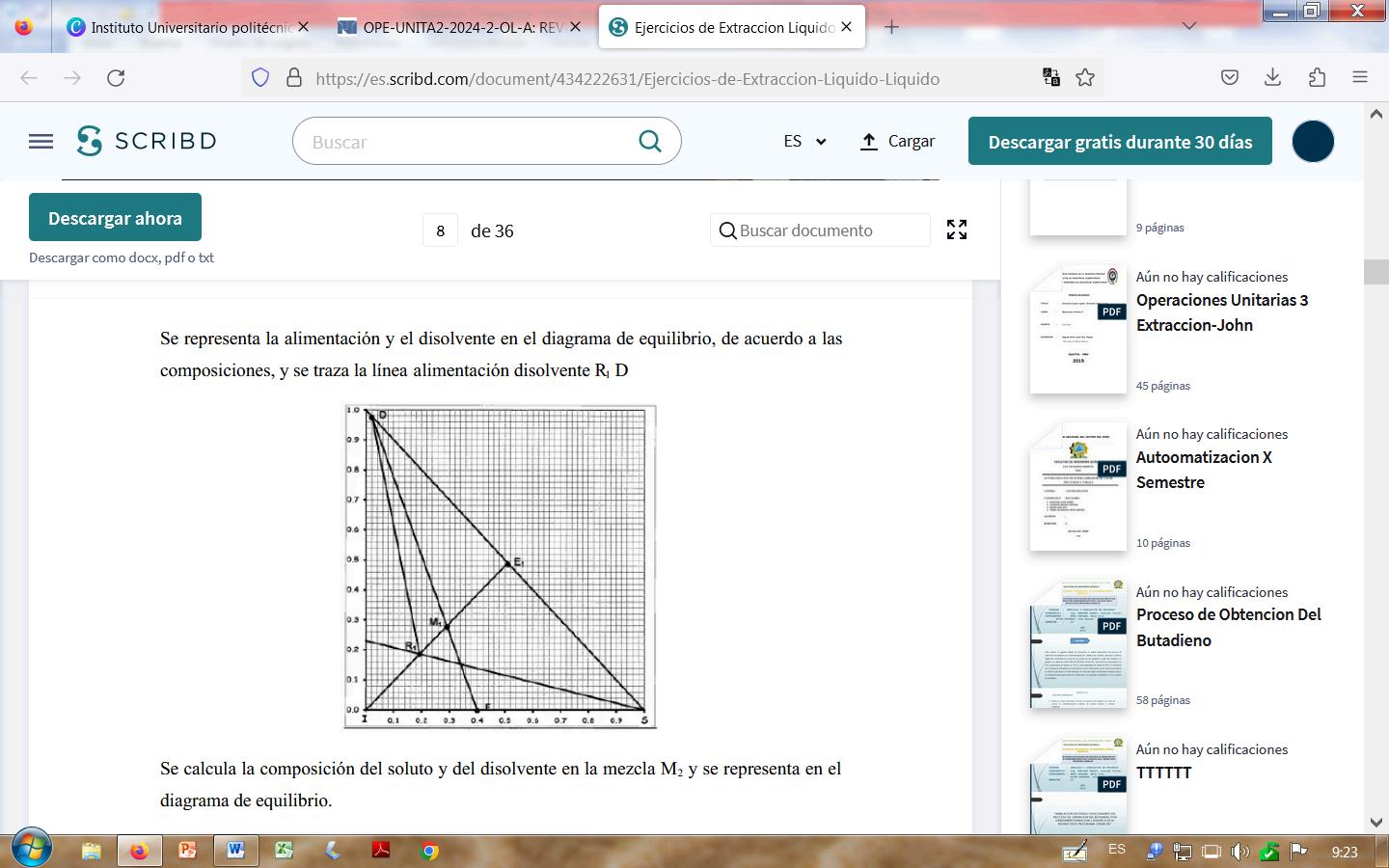 Una harina que contiene aceite ha de extraerse con un disolvente, constituido mayormente por benceno, operando en un sistema de extracción en flujo cruzado en dos etapas.Al sistema de extracción se hace ingresar 100 kg/h de alimentación, que contiene 40 % peso de. aceite, y un disolvente que contiene 98 % peso de benceno y 2 % peso de aceite,utilizándose 40 kg/h y 20 kg/h respectivamente en cada etapa de extracción.