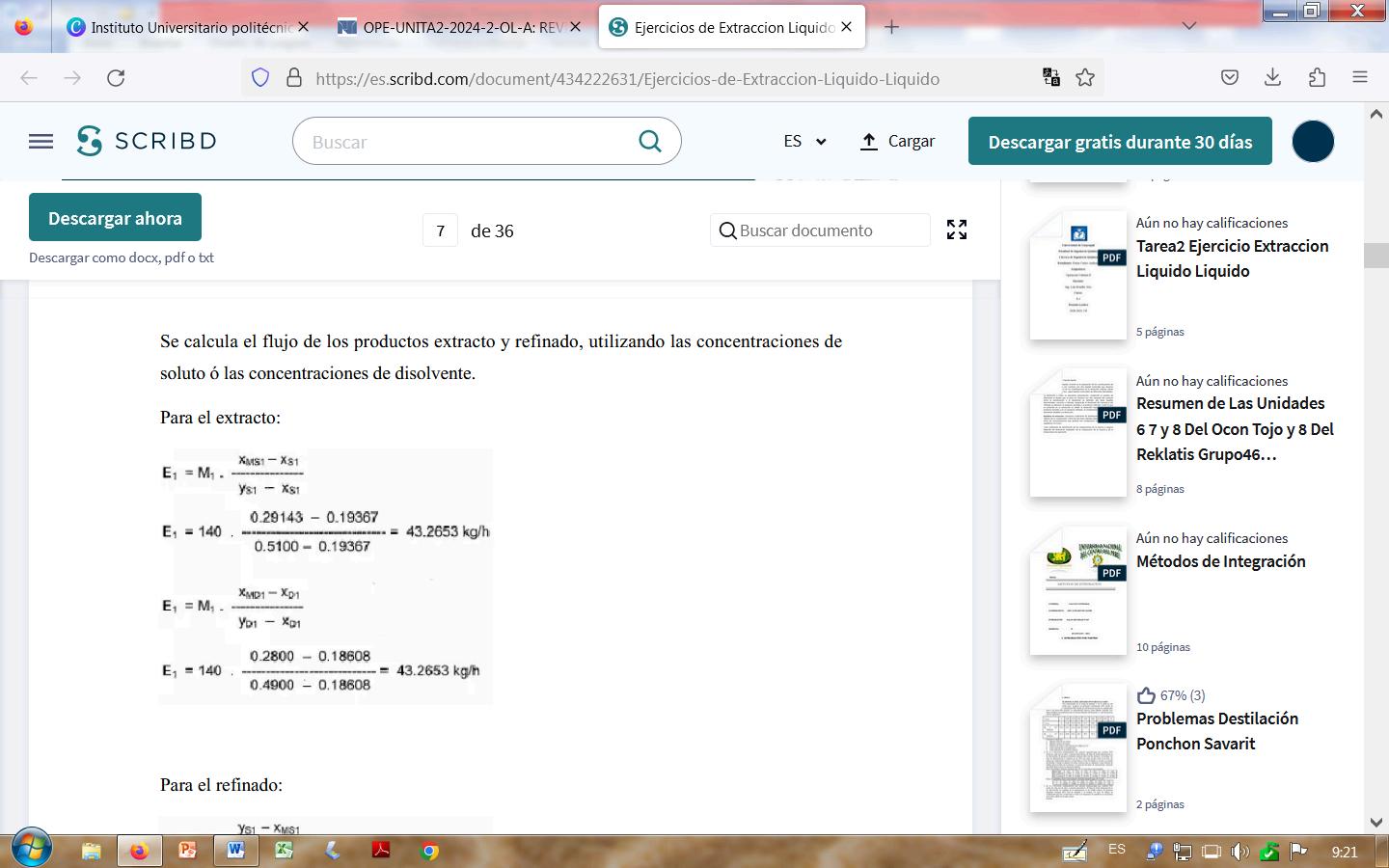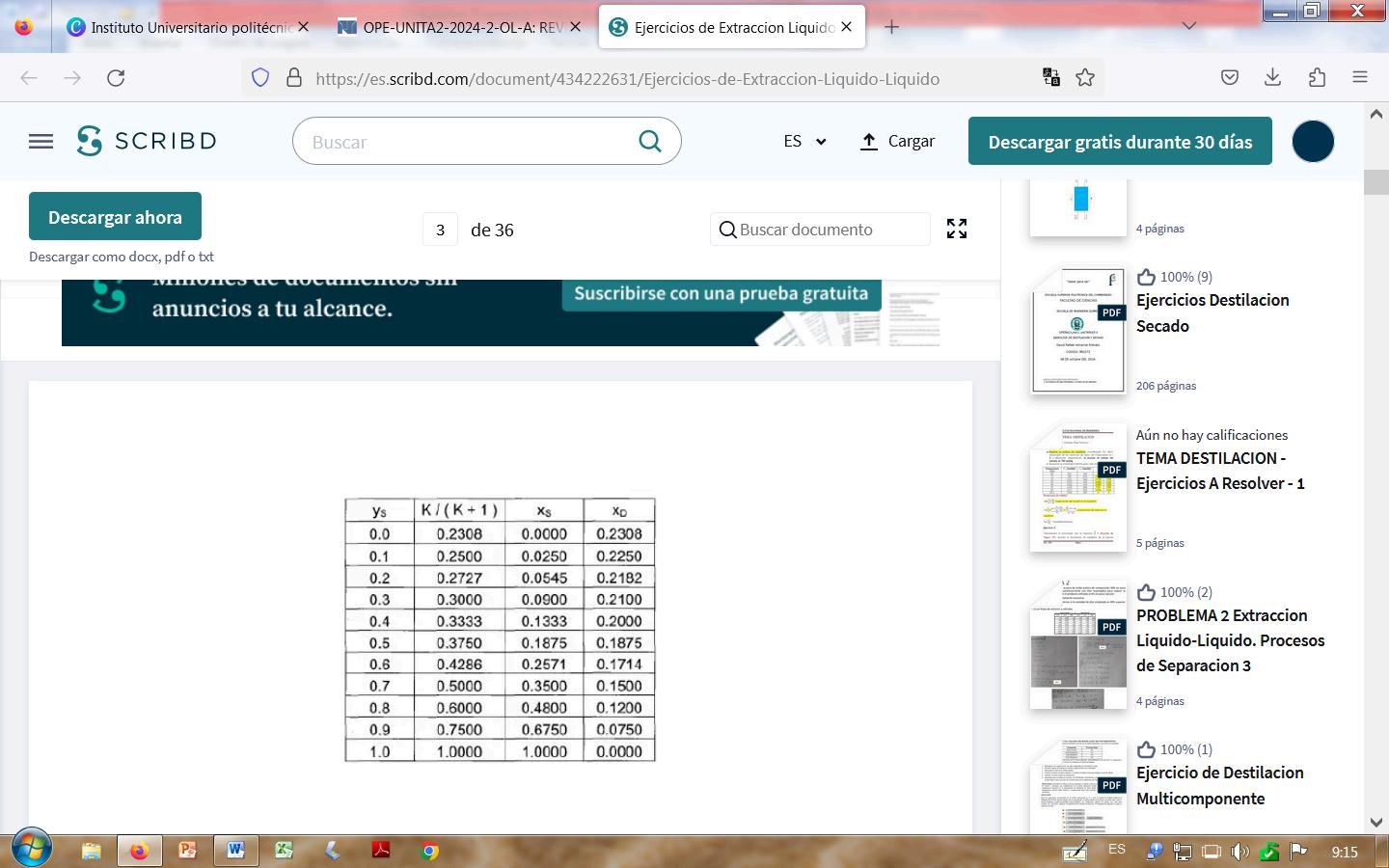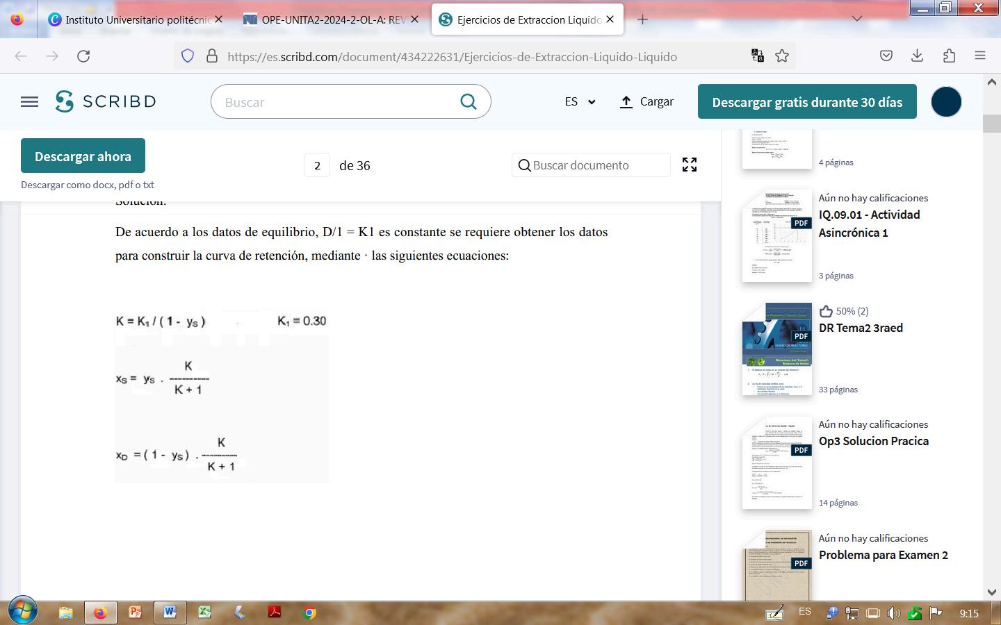 Experimentalmente se ha encontrado que la relación disolvente 1 sólido inerte es constantee igual a 0.30.Calcular los flujos de extracto y refinado en cada etapa, el flujo y composición del extractocompuesto, así como el porcentaje de aceite extraído.Solución:De acuerdo a los datos de equilibrio, D/1 = K1 es constante se requiere obtener los datos para construir la curva de retención, mediante · las siguientes ecuaciones: