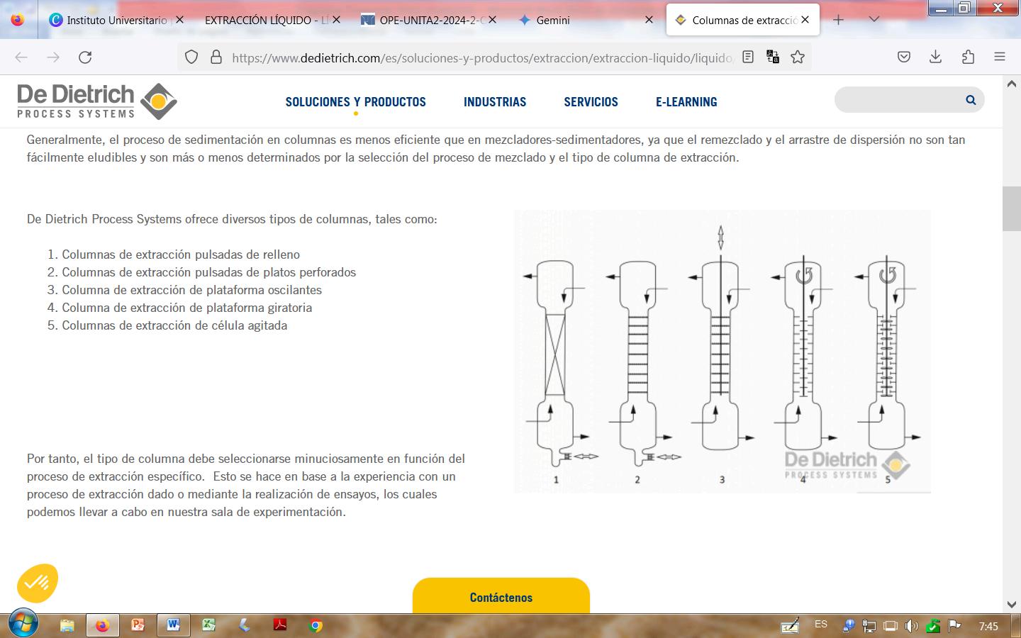 Columnas de Extracción: Se utilizan columnas de diferentes diseños (platos perforados, relleno, etc.) para aumentar la superficie de contacto entre las fases y mejorar la eficiencia de la extracción.