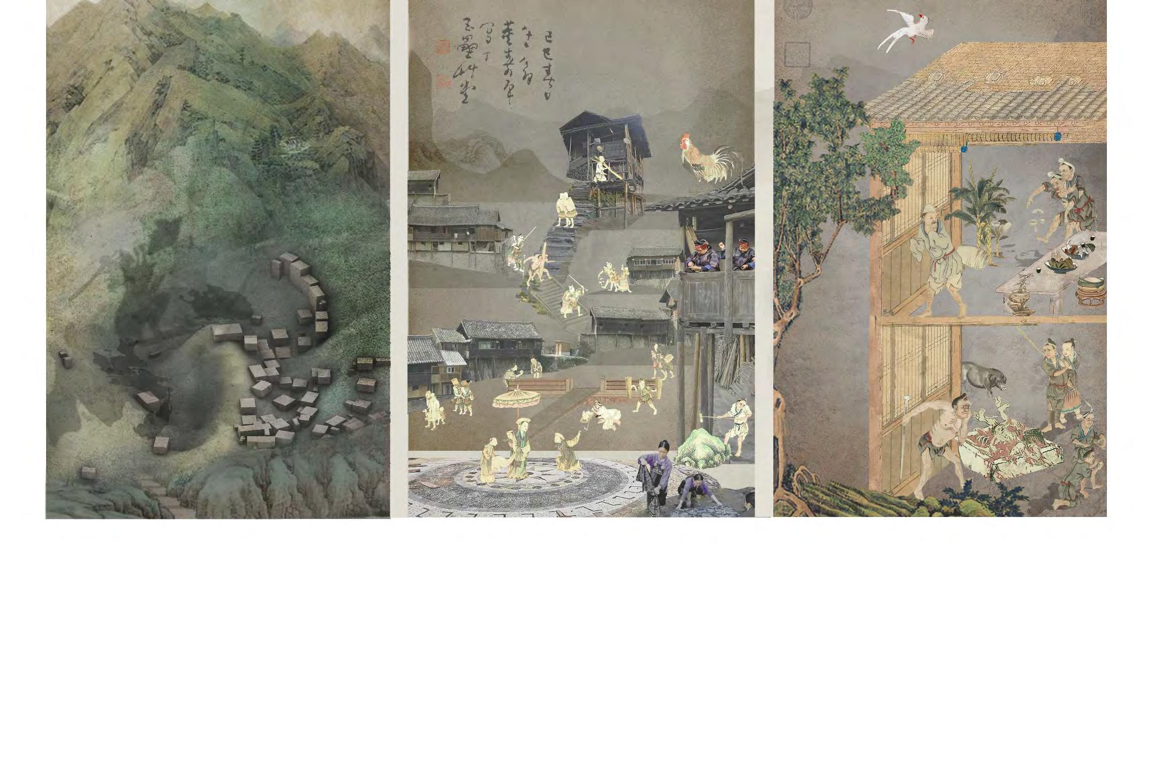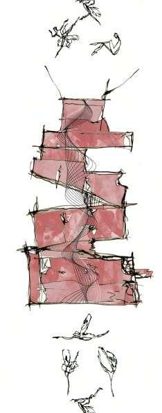 The element of anticipation that is present in the narrative in the central part of the poem. Here the Miao people are expecting visitors and preparing an attack. This feeling of anticipation is translated through the element of vertical communication and transition spaces. Through these spaces we are gradually building up from the flexible extroverted shell and penetrating inside the fixed core.