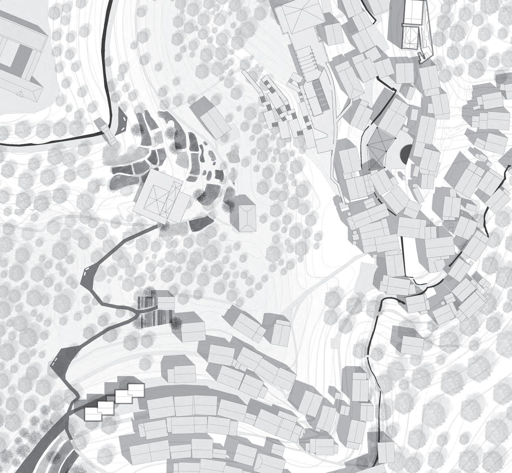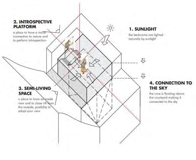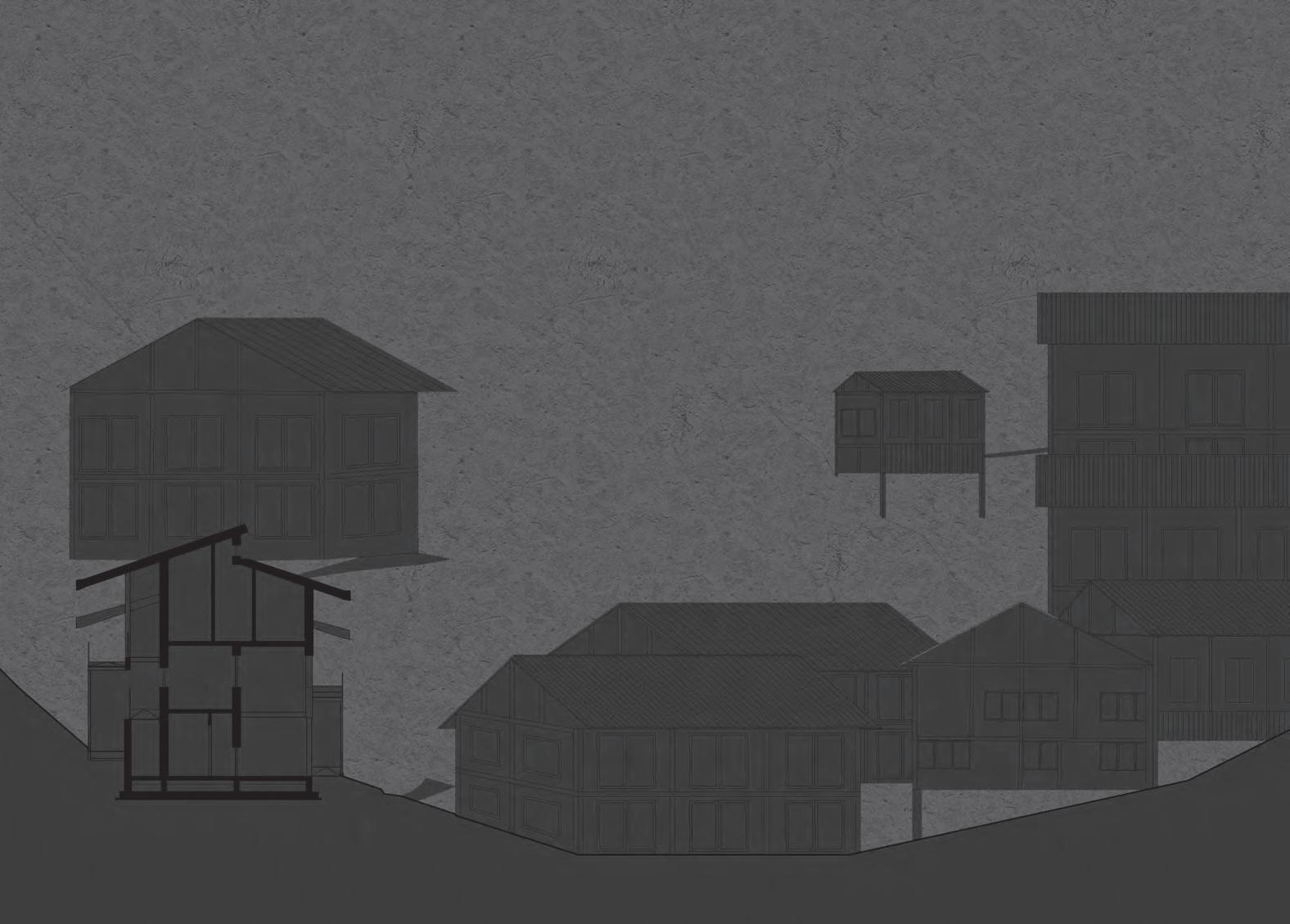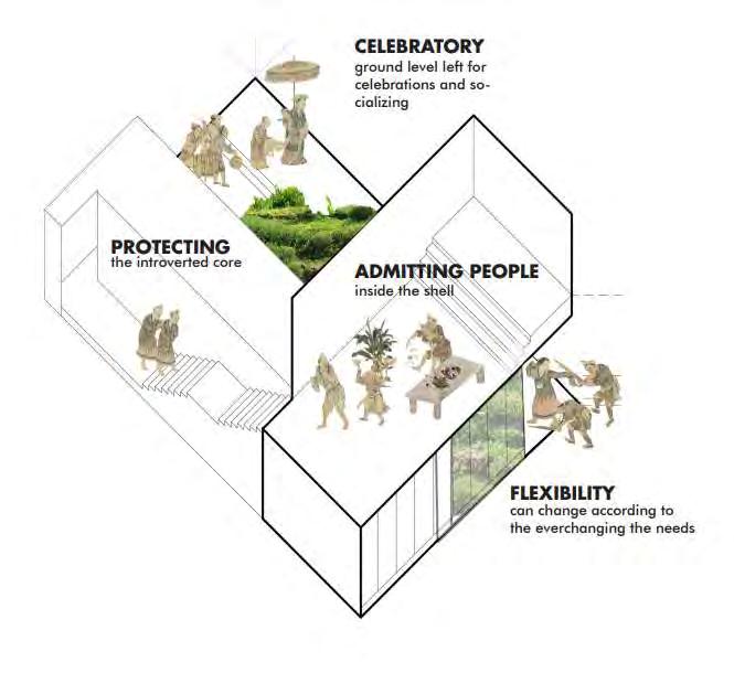 The people of Miao are looking for a sheltered home that can be a place to hide from the outside worldand to be protected from the harsh environment. The modality chose is that of providing a double facade/shell from outside and by lifting the core off the ground, as it is floating. This way the public realm is connected and rooted to the ground, but the private is floating above connected to the sky.