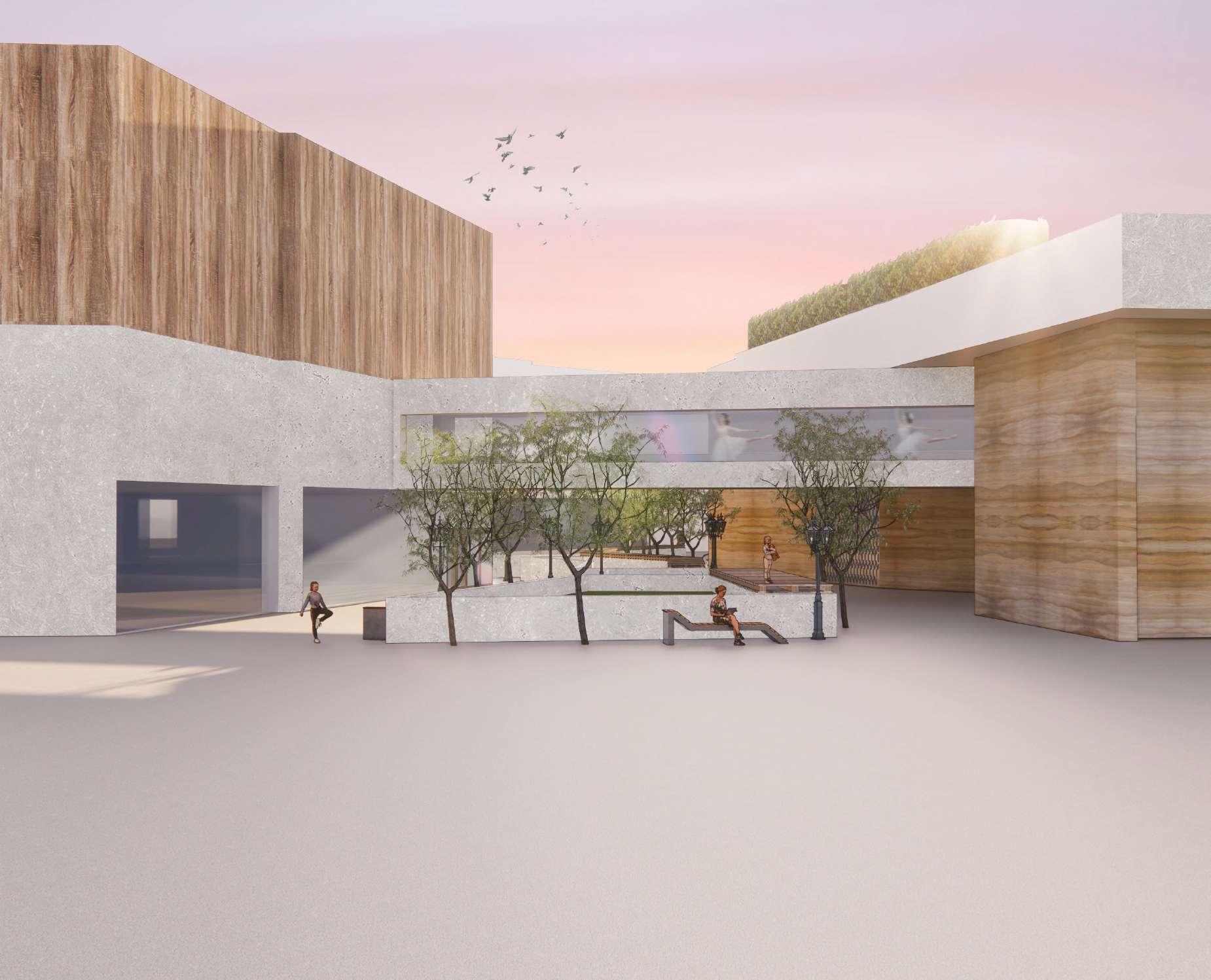 Part of the masterplan is the public courtyard in between, which is also shaped using the same geometrical forms, bringing together the different structures located on the site.