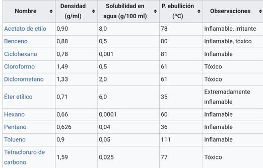 Tabla con disolventes orgánicos de uso más frecuente en las operaciones de extracción líquido-líquido