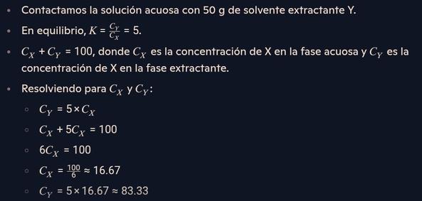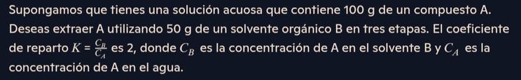 Unaalimentaciónde100gdesoluciónacuosadeAdebeserextraídacon100gdesolventeorgánicoBen unaoperacióncontracorrientedetresetapas.Elcoeficientedereparto