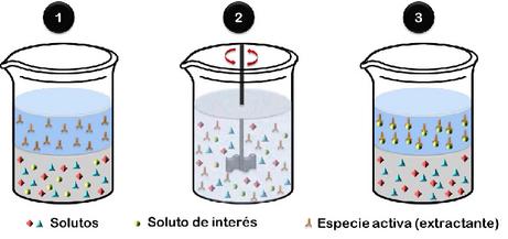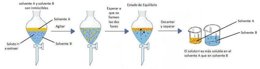 En la extracción líquido-líquido, son empleados dos disolventesinvisiblesentresí,enlamayoríadeloscasos uno de estos es agua o una disolución actuosa y el otro componente suele ser un disolvente orgánico de muy bajapolaridad..