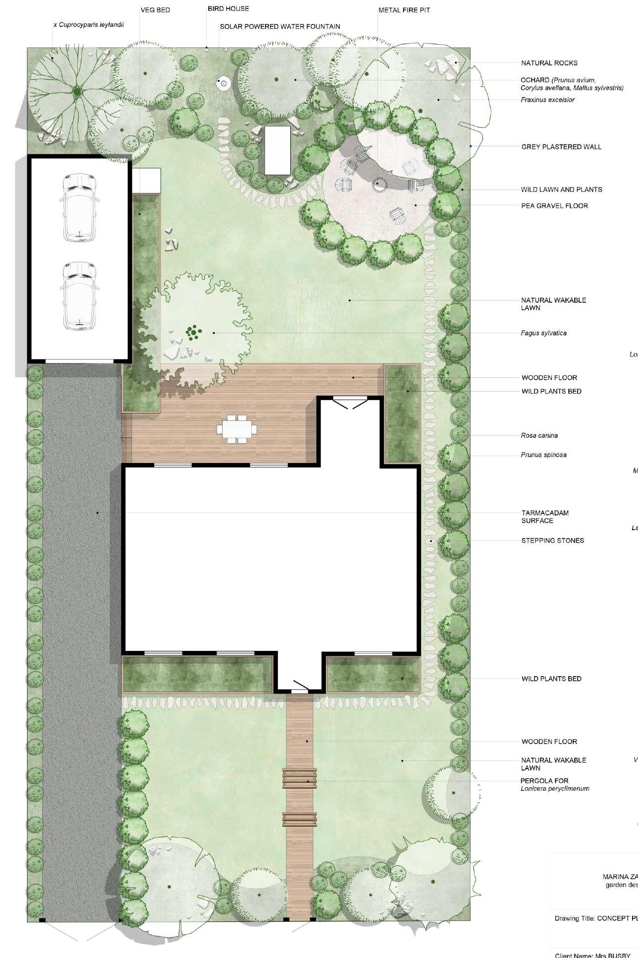 From the front windows, a en on is immediately drawn to horizontal pergolas adorned with the cap va ng Lonicera periclymenum (Na ve Honeysuckle), their yellow/white blossoms and sweet fragrance crea ng ver cal focal points within the garden. At the garden's rear, a majes c Fagus sylva ca (Beech) tree commands a en on, par cularly in autumn when its golden-brown foliage casts a mesmerizing spell visible from everycornerofthegarden.