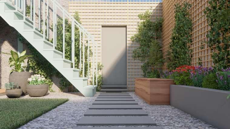 Following the stepping stones further unveils the garden's untamed heart, where life flourishes with the nurturing touch of nature. A solarpowered water fountain beckons birds and bees, offering them respite and a place to call home within the carefully cra ed birdhouse Connec ng the wooden deck to other parts of the garden's rear is a walkable lawn inten onally le untrimmed, embracing a naturalis c aesthe c.Thisdeliberatelaissez-faireapproachextendstothefrontlawn, fosteringacohesivestylethroughout.