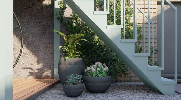 Three corten steel planters have been thoughtfully filled with a selection of perennials and evergreen plants. These carefully chosen plants boast low-maintenance qualities and exhibit a diverse range of sizes and textures, resulting in a captivating compositionthatharmonizesbeautifullywithoneanother