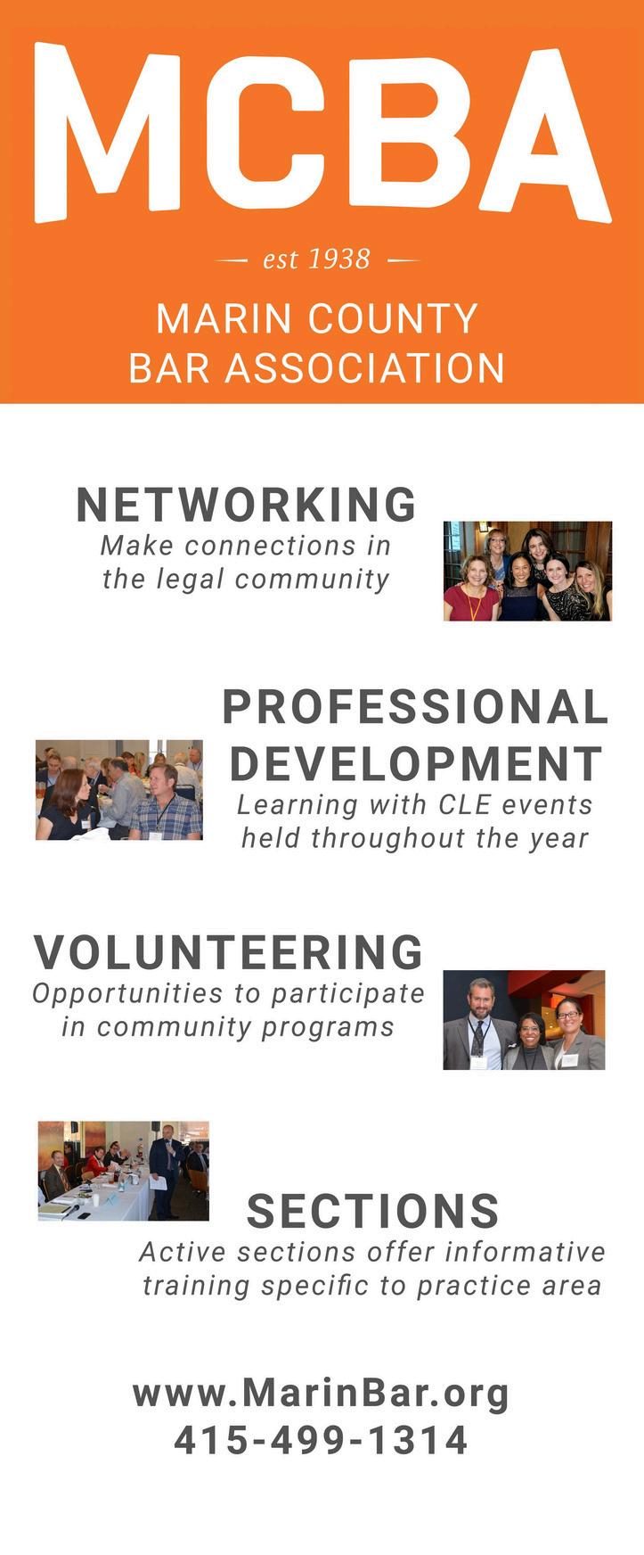 On the front page of the MCBA’s newly designed website is the mission statement of our organization, which provides: “To involve, encourage and support Bar Association members, to serve as a liaison to the Marin County courts, and to educate the community and enhance access to legal services.”