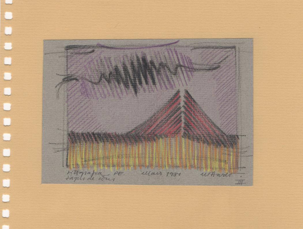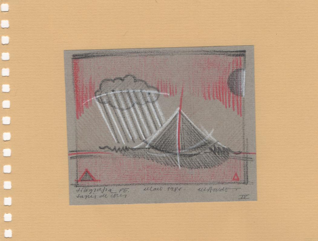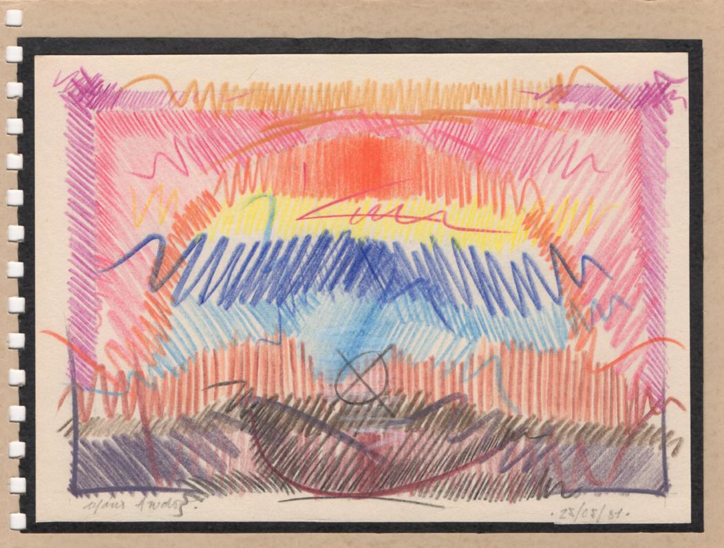 O quarto deles, de capa parda clara também, traz desenhos mais coloridos com muitas “paisagens” consteladas por escritas meio cifradas, rabiscos achurados e/ou livres, em tábulas e emolduramentos, com alguns signos e símbolos usuais, além de algumas colagens discretas e quatro pequenas provas litográficas com vulcões. Penso que essas anotações experimentam unir algumas das visões já registradas nos álbuns anteriores, brincando com rearranjos.