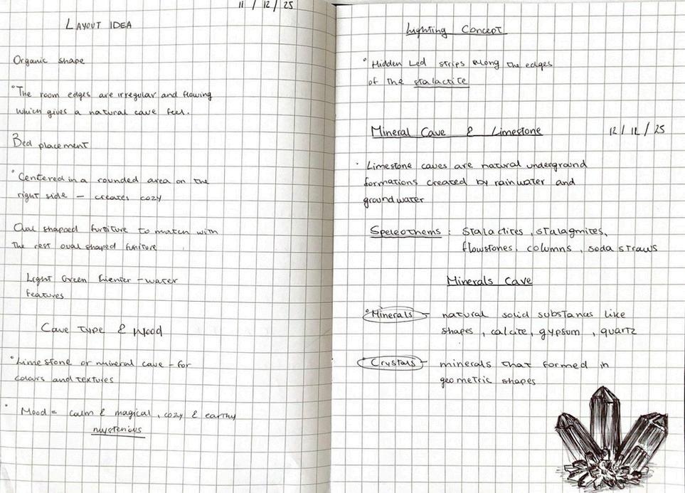 I am currently developing an interior room design inspired by caves and natural textures and colours, with the aim of creating a mysterious, dramatic atmosphere located in Italy.