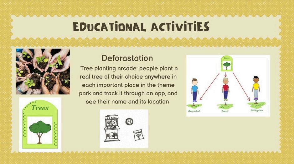 I researched countries such as Syria, Bangladesh, Brazil, Australia, the Philippine, and the Maldives that are severely affected by humans activity. I designed a theme park where visitors can travel through small sections of these places in their damaged state, helping them understand the impact of pollution and climate change. The main ride is a plane, with CO2 smoke trailing being it to represent environmental harm caused by humans.