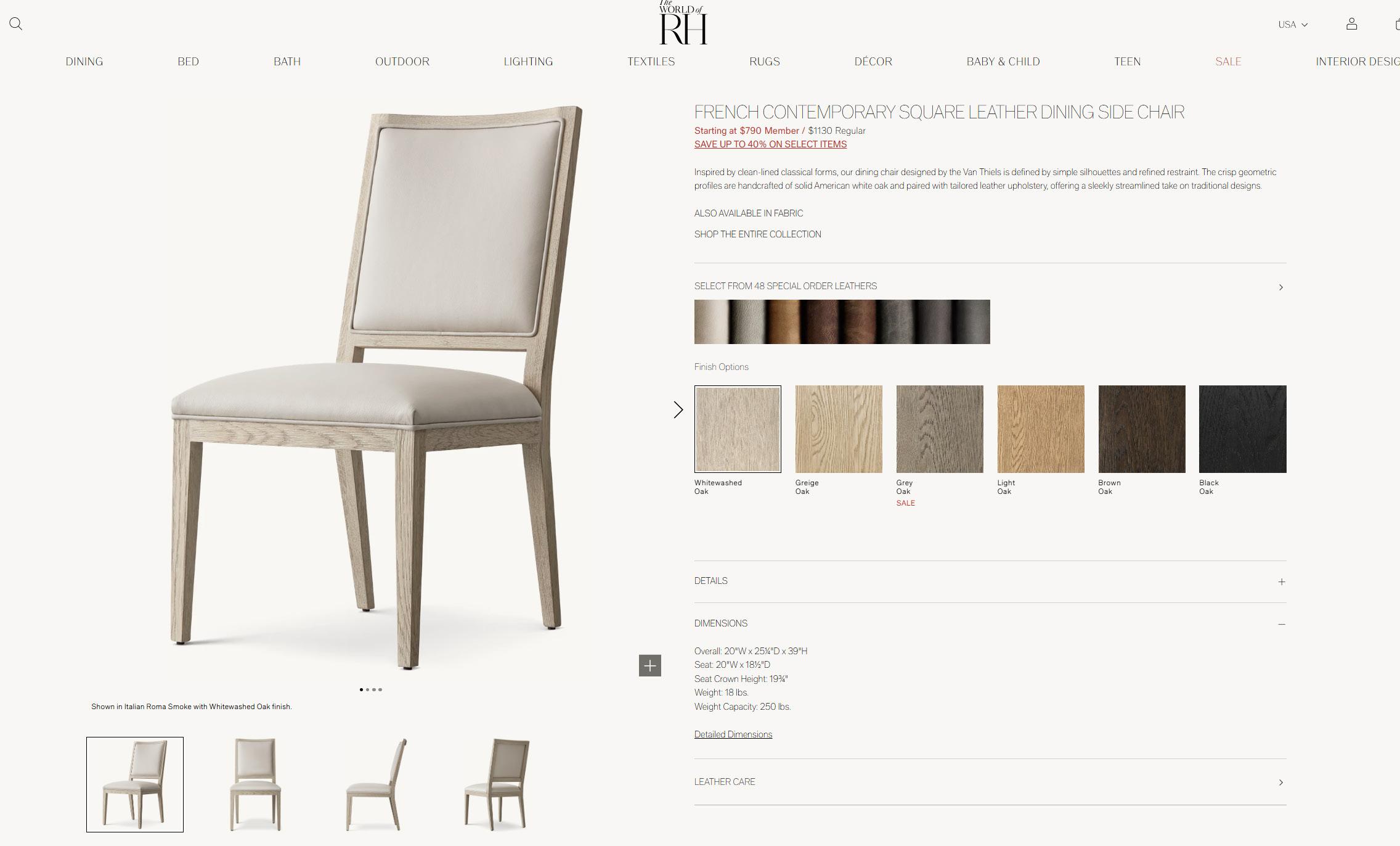 9. RH- FRENCH CONTEMPORARY SQUARE LEATHER DINING CHAIR- (Italian Roma Smoke with Whitewashed Oak finish)- $966 10. RH- FRENCH CONTEMPORARY SQUARE LEATHER DINING CHAIR- (Natural Belgian Linen with Whitewashed Oak finish)- $876 11. RH- FRENCH CONTEMPORARY ROUND FABRIC DINING CHAIR- (Natural Belgian Linen with Grey Oak finish)- $876