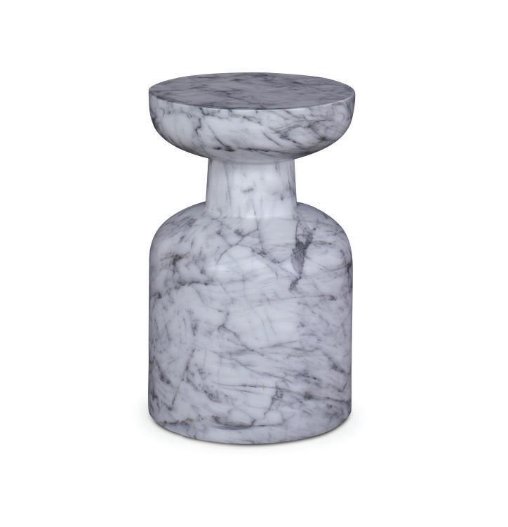 Proportion and shape define this outdoor end table. Shaped from aged white concrete with a parchmentlike texture for softness and dimension. Also available in a nesting pair. Cover or store indoors during inclement weather and when not in use.