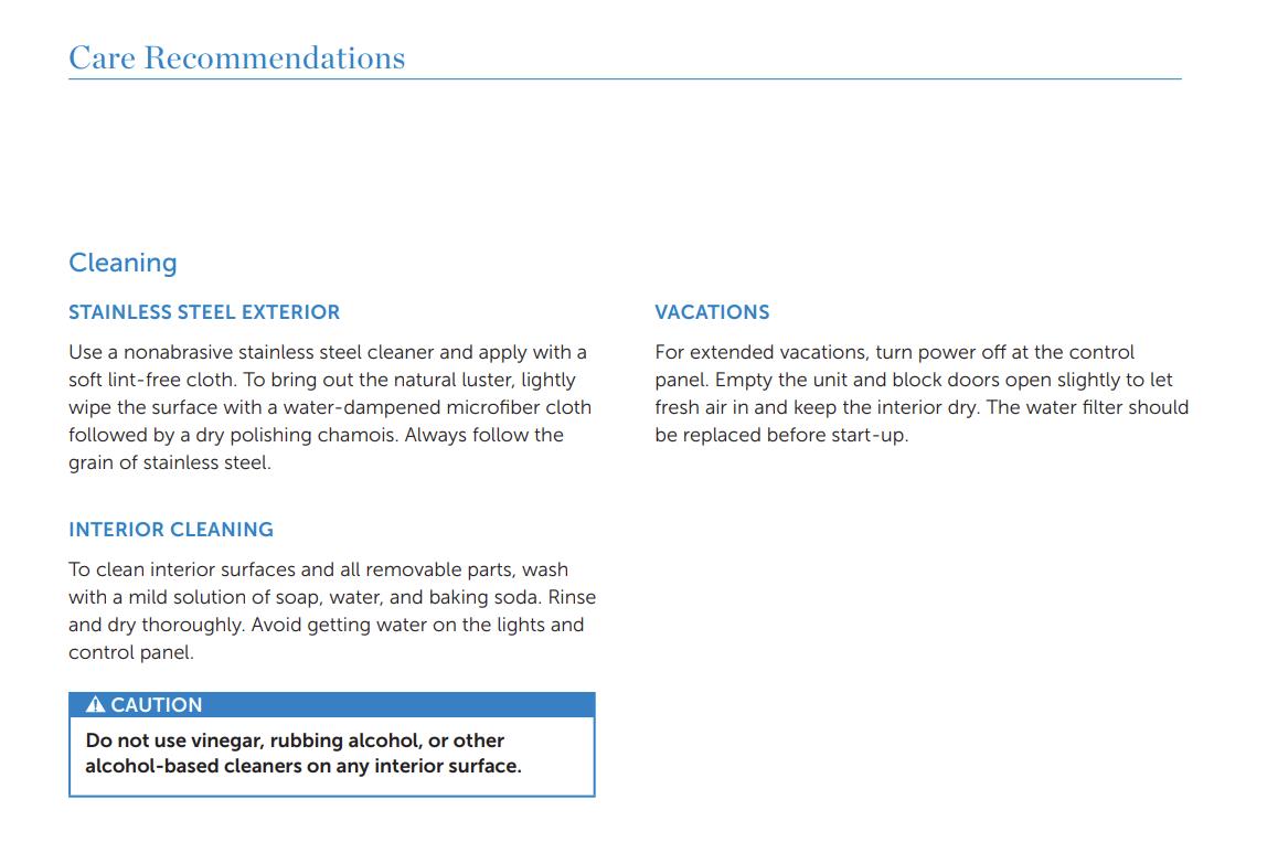 Stainless steel Use a nonabrasive stainless steel cleaner and apply with a soft lint-free cloth. To bring out the natural luster, lightly wipe surface with a water-dampened microfiber cloth followed by a dry polishing chamois. Always follow the grain of stainless steel. The stainless steel drawer pan is removable for cleaning. To remove, open drawer completely. Slide fingertips under side edges of pan, pull up and out. Control panel Use a spray degreaser to remove fingerprints and food soil. Spray on a cloth before wiping panel. Do not spray cleaners directly on the control panel. Removable Rack Clean with hot water and mild detergent or paste of baking soda and water. Towel dry. Interior Wipe with a soft damp cloth. Do not use abrasive or harsh cleaners or scouring pads. For heavier soil, use baking soda or a mild soap; rinse thoroughly with hot water. Drawer Guides Remove food crumbs from drawer guides. Wipe with a soft dry cloth.