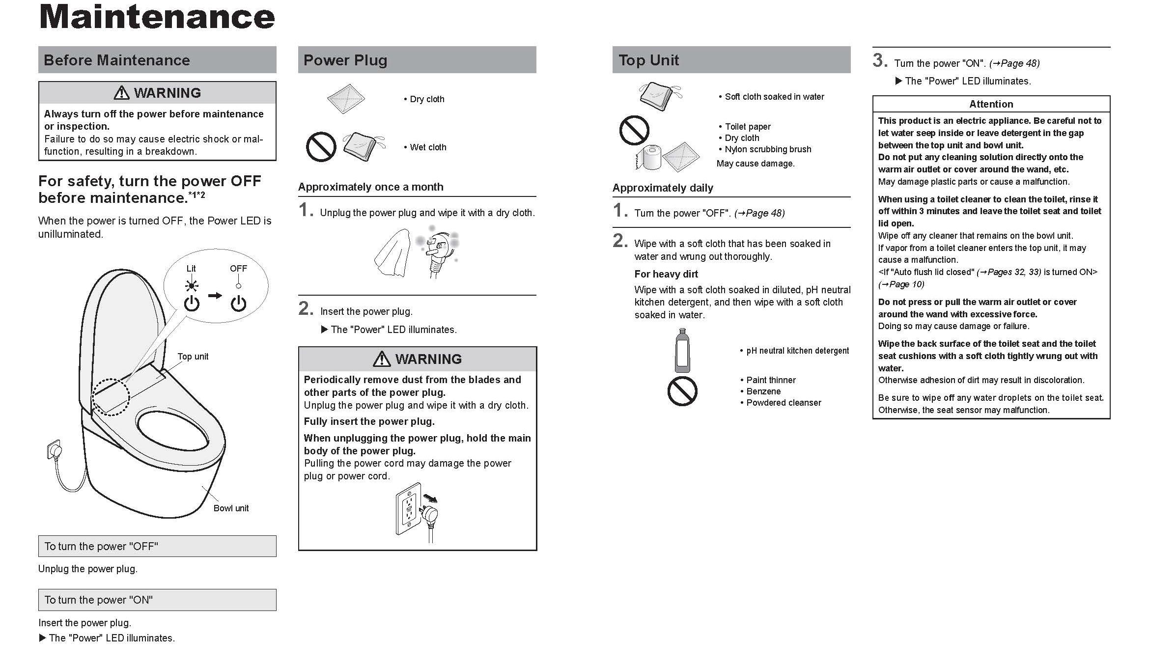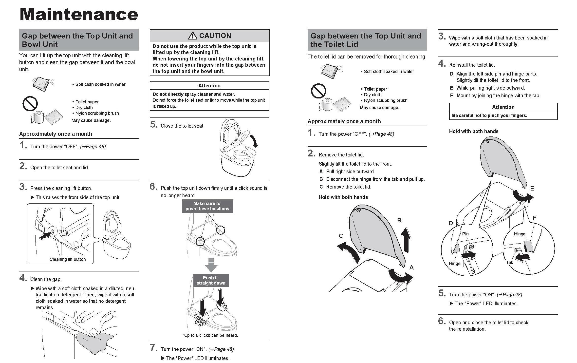 • Use a mild dish detergent to clean your lavatory. • Use a gel-based toilet bowl cleaner. • Use a soft cloth to clean your lavatory. • Use a soft-bristled plastic brush to clean your toilet. • Don’t use cleanser, polishing powders or detergents that have gritty or coarse particles. • Don’t use bleach, chemical thinners, or products that include acid or alkaline detergents in their ingredients. • Don’t use metal scrub brushes or steel wool.