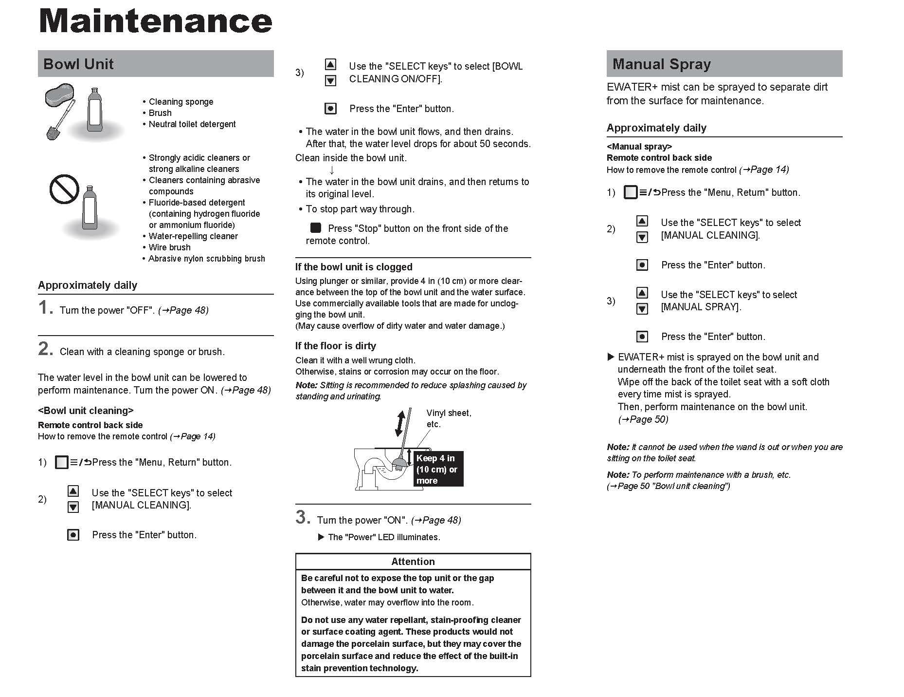 DO NOT USE IN-TANK BOWLCLEANERS. The use of high concentration of chlorine or chlorine-related products can seriously damage fittings in the tank. This damage can cause leakage and property damage. TOTO shall not be responsible or liable for any tank fitting failure or damage caused by the use of in-tank bowl cleaners.