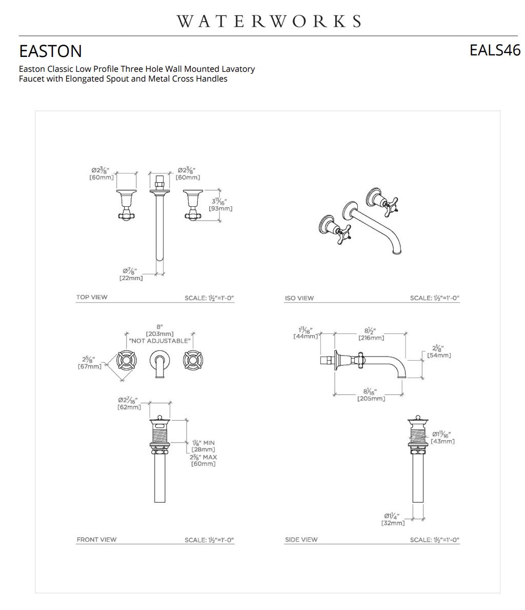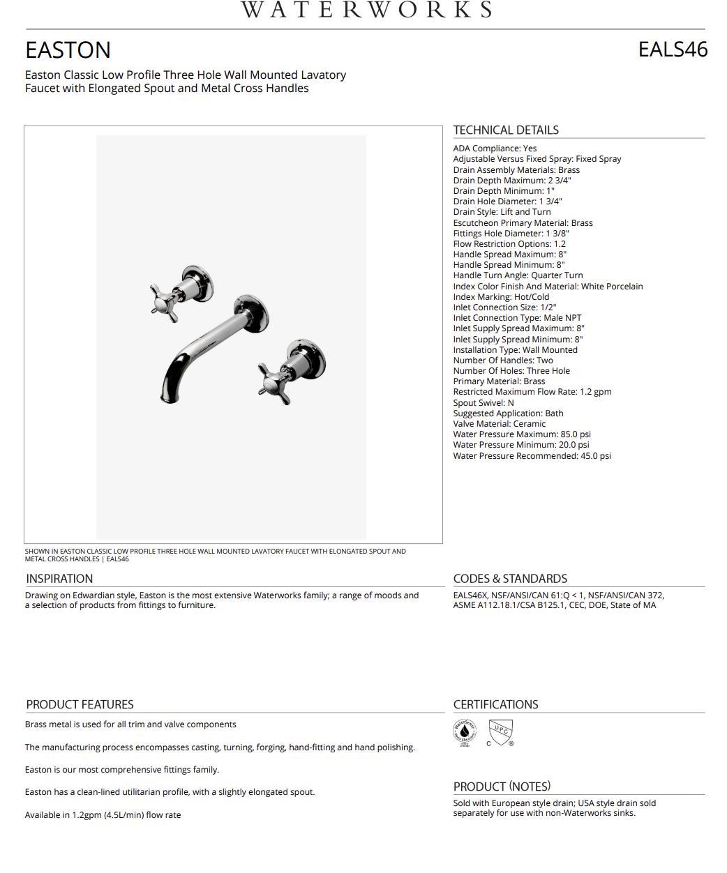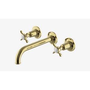 EASTON CLASSIC LOW PROFILE THREE HOLE WALL MOUNTED LAVATORY FAUCET WITH ELONGATED SPOUT AND METAL CROSS HANDLES BRASS