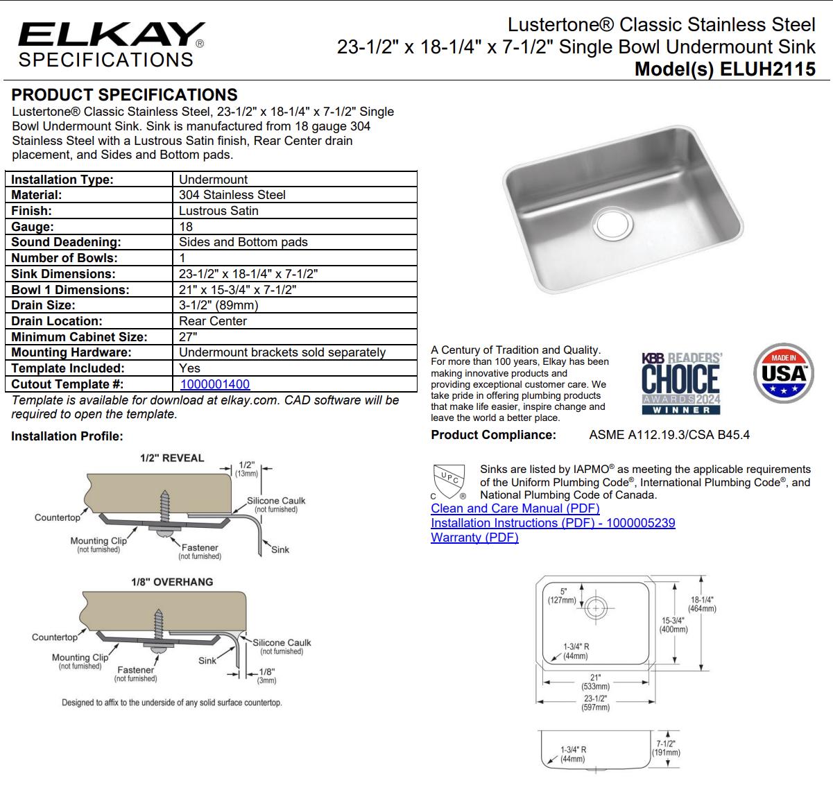 With proper care and maintenance, your Elkay stainless steel sink will give you a lifetime of service. Below are the suggestions for the care and cleaning of your Elkay sink. General Cleaning It is recommended to clean Elkay sinks daily to avoid build-up of soap or mineral deposits, as these tend to have an adverse effect on the appearance of the product. For daily cleaning use an ordinary mild detergent and soft cloth to rinse and dry the sink. Allowing water or cleaners to evaporate on metal will negatively impact the look of the sink. To avoid this, it is important to dry the sink after each use. • To avoid unwanted build-up, it is recommended to dry your sink after each use. • Soft abrasive cleaners may be used when necessary (Blue Scotch-Brite Pads). Strong abrasive cleaners will scratch and dull the surface (Green Scotch-Brite Pads). Do’s • It is recommended the use of an Elkay bottom grid or rinsing basket to protect your sink. • Run cold water when pouring boiling water into sink. • It is recommended that you clean your sink prior to first use. Do Not’s • Avoid storing open containers of household cleaners and chemicals containing chloride such as bleach, acid, and drain cleaners or toilet bowl cleaner beneath the sink. Vapor emission from the chlorides can cause corrosion and pitting to the exposed stainless steel and other metals including faucet water supply lines. • Do not use dish mats as these can trap soap and dirt making sink maintenance more time-consuming and cultivate harmful bacteria. • Do not leave standing water in your sink, especially if the water contains anything that could stain the sink (i.e. coffee or tea). Stainless Steel Light scratches are normal for stainless steel sinks; over time they will blend into the uniform finish pattern. • Steel soap pads, steel wool, or wire brushes should never be used; particles can adhere to a stainless steel sink surface and will eventually rust. If an abrasive pad must be used Elkay recommends Scotch-Brite Non-Scratch (blue Scotch-Brite pad). • Do not use cleaners containing ammonia, bleach, or other harsh chemicals. Chemicals containing chlorides (bleach) are particularly damaging to stainless. If used, rinse the surface immediately to prevent corrosion. Recommended Cleaning Products: • Bar Keeper's Friend Soft Cleanser • Stainless steel cleaner & polish • Or any mild detergent