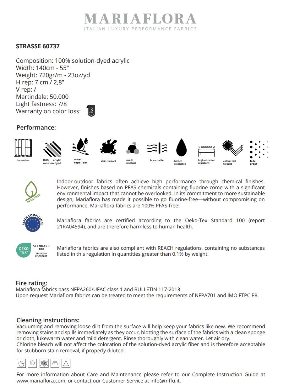 Under normal conditions Mariaflora Italian Luxury Performance Fabrics can be dry cleaned, and hand- or machine-washed with a gentle 30°C (86°F) cycle and a soft detergent. Low speed spin dry, then air dry. Avoid using tumble dryers and high pressure cleaners as they could damage the fabrics.
