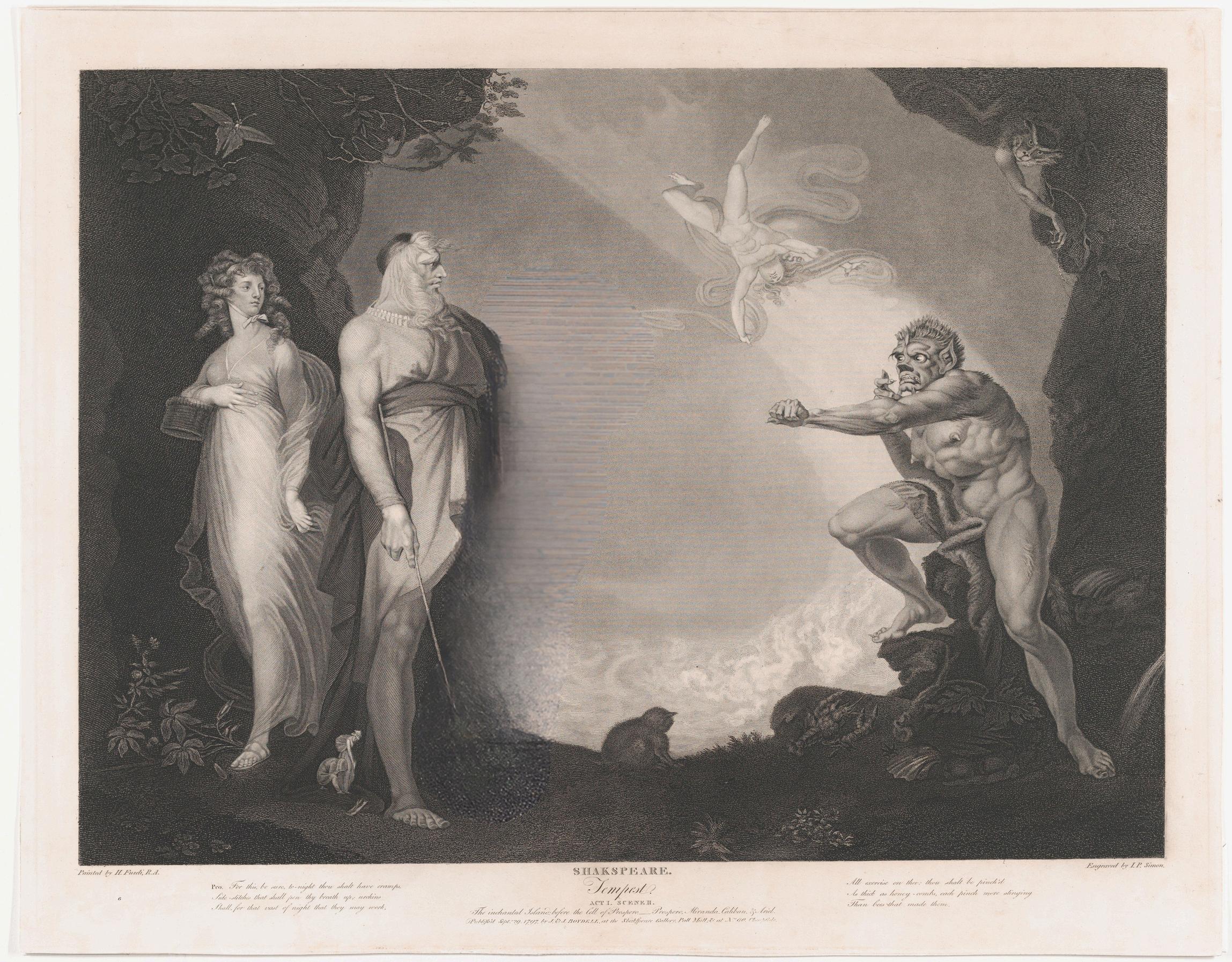 John Dryden and William Davenant’s The Tempest, or The Enchanted Island (Gillespie Collection, 1690) portrays a softened, Reformation-era retelling of The Tempest, that emphasizes Ariel and Caliban’s subjugation. Ariel defends her independence and questions the “Mortal” (Prospero) in holding her servitude. However, she later contradicts this self-defense, claiming, “And our own power has our subjection wrought!” In taking responsibility for her own captivity, Dryden and Davenant’s Ariel models a dramatic version of vanishing indigenous culture and existence, as Ariel curses the magic of her own people.