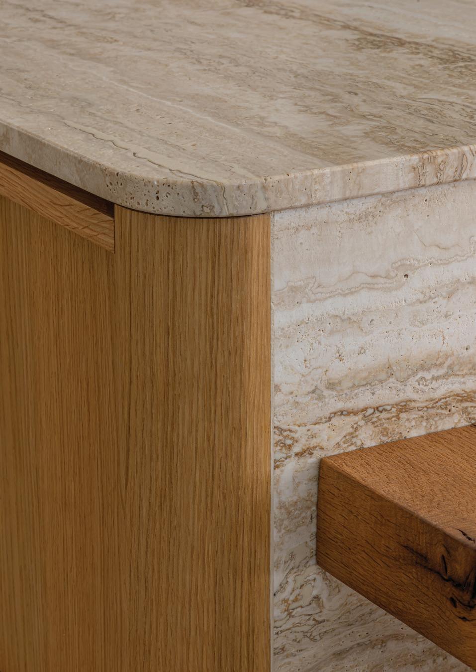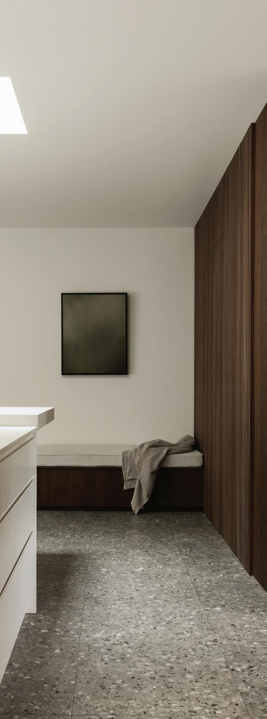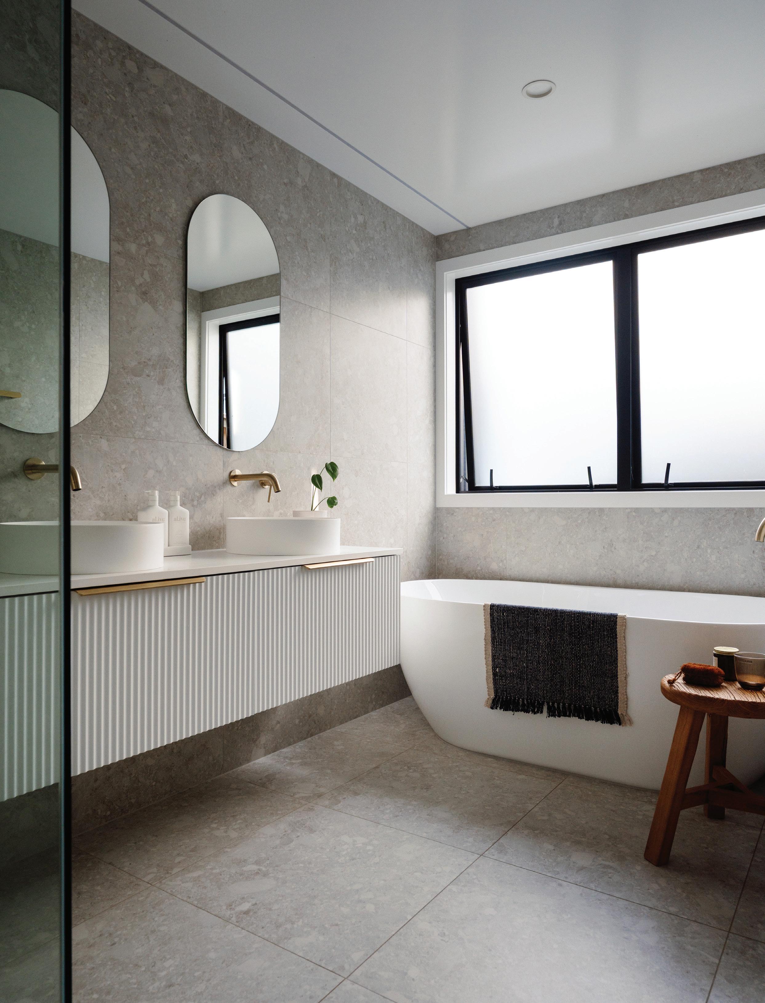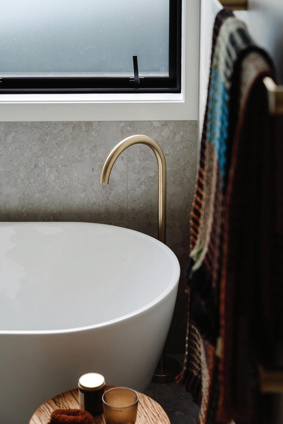 In the bathrooms, the homeowners wanted a soft neutral tile, nothing too dark or light. “This classic subtle terrazzo style tile works in well with the fluted vanity fronts and brass fixtures and tapware to add some more luxury and warmth to the space,” says Nicola. Brass tapware, sink plugs and draw handles complement the fluted rippled feature panels on the vanity drawers. The stone vanity tops were selected for practicality and luxury.