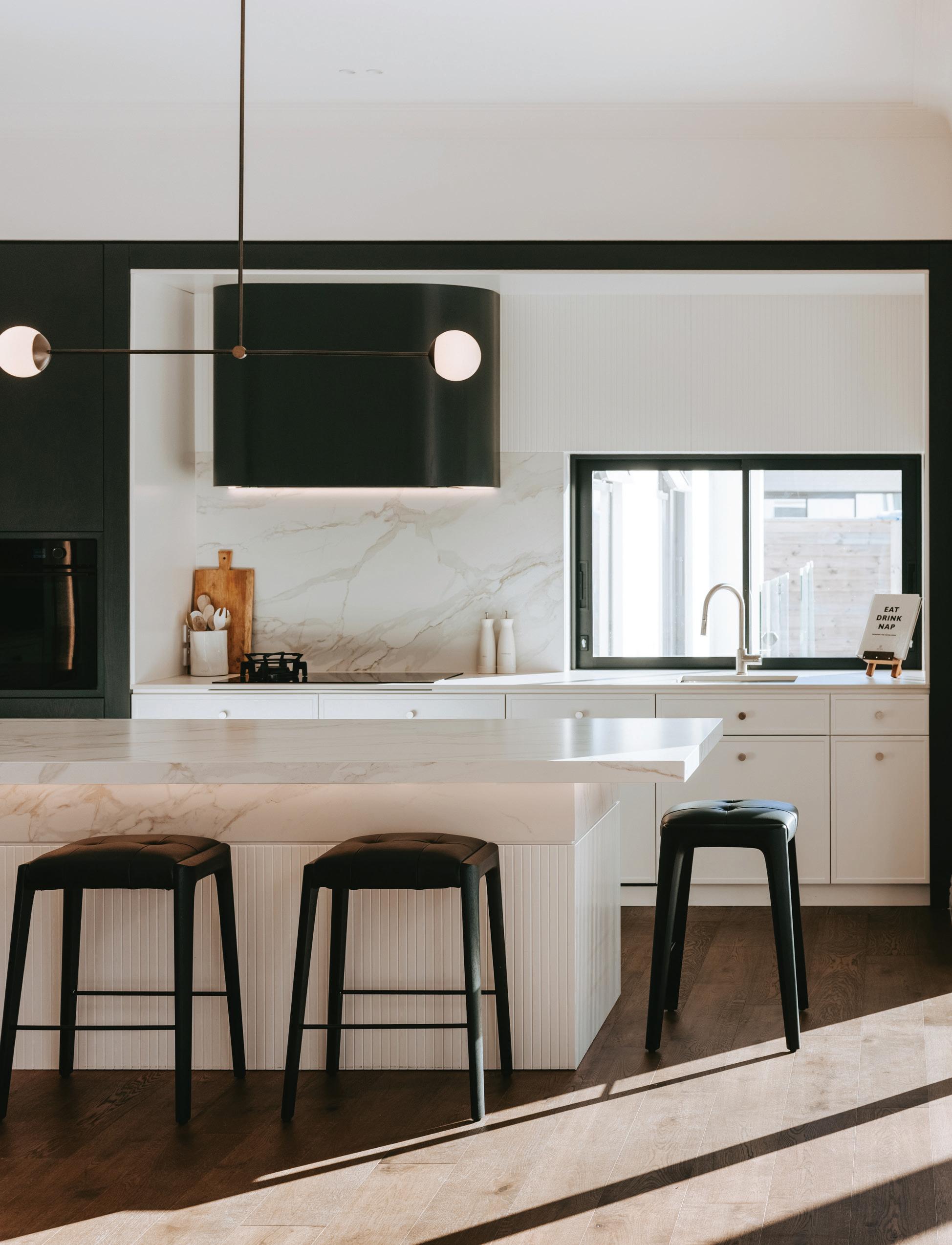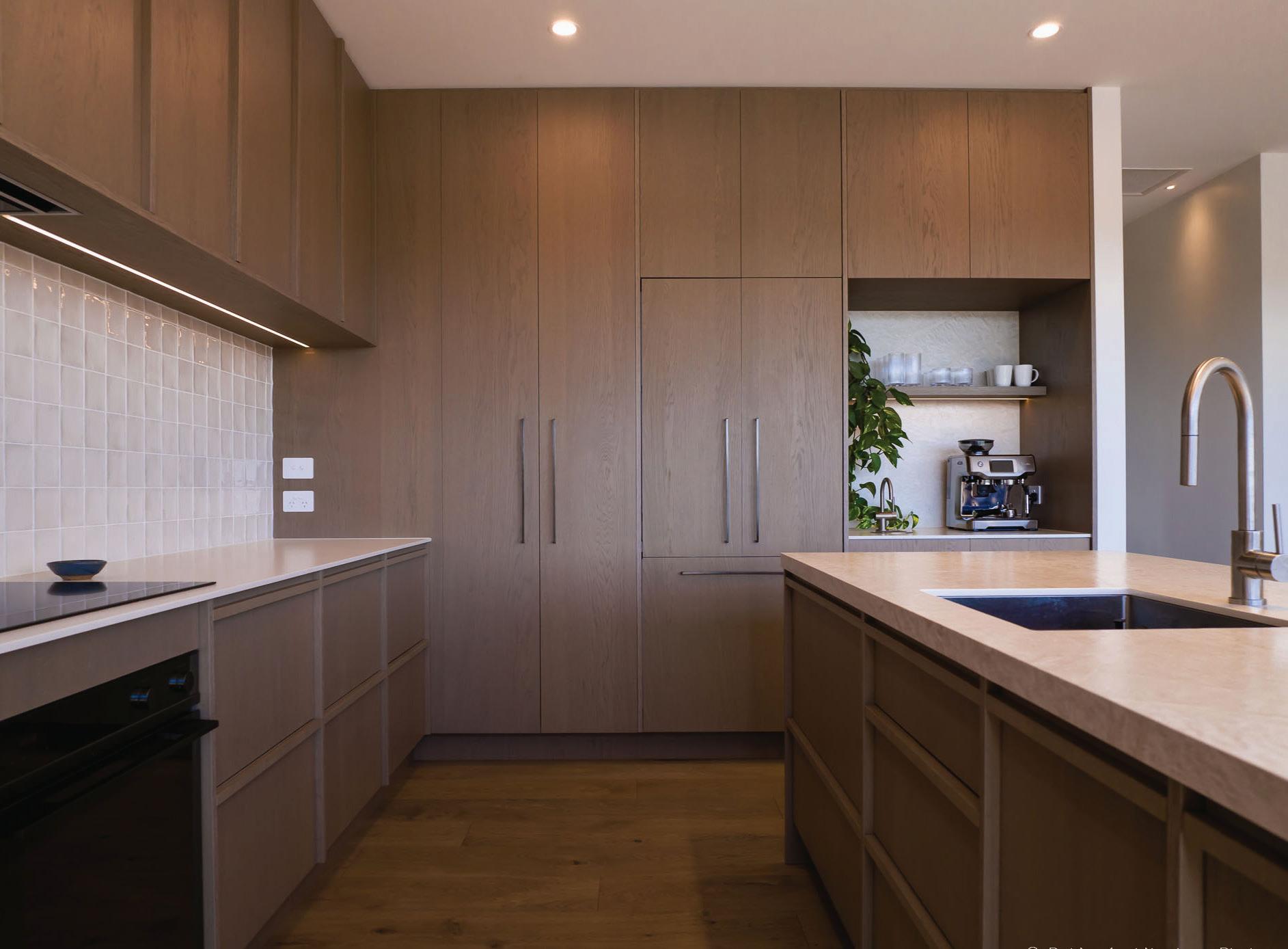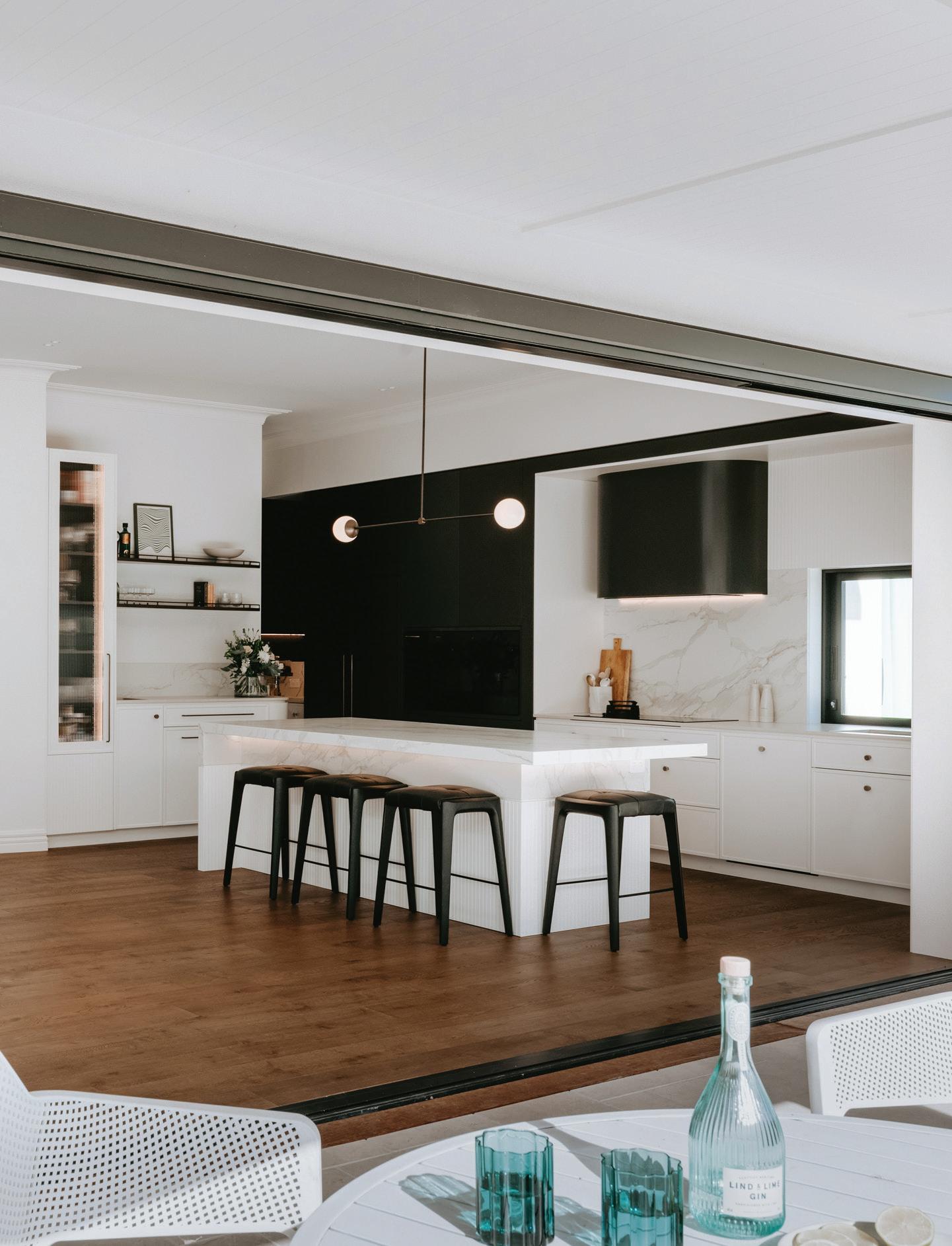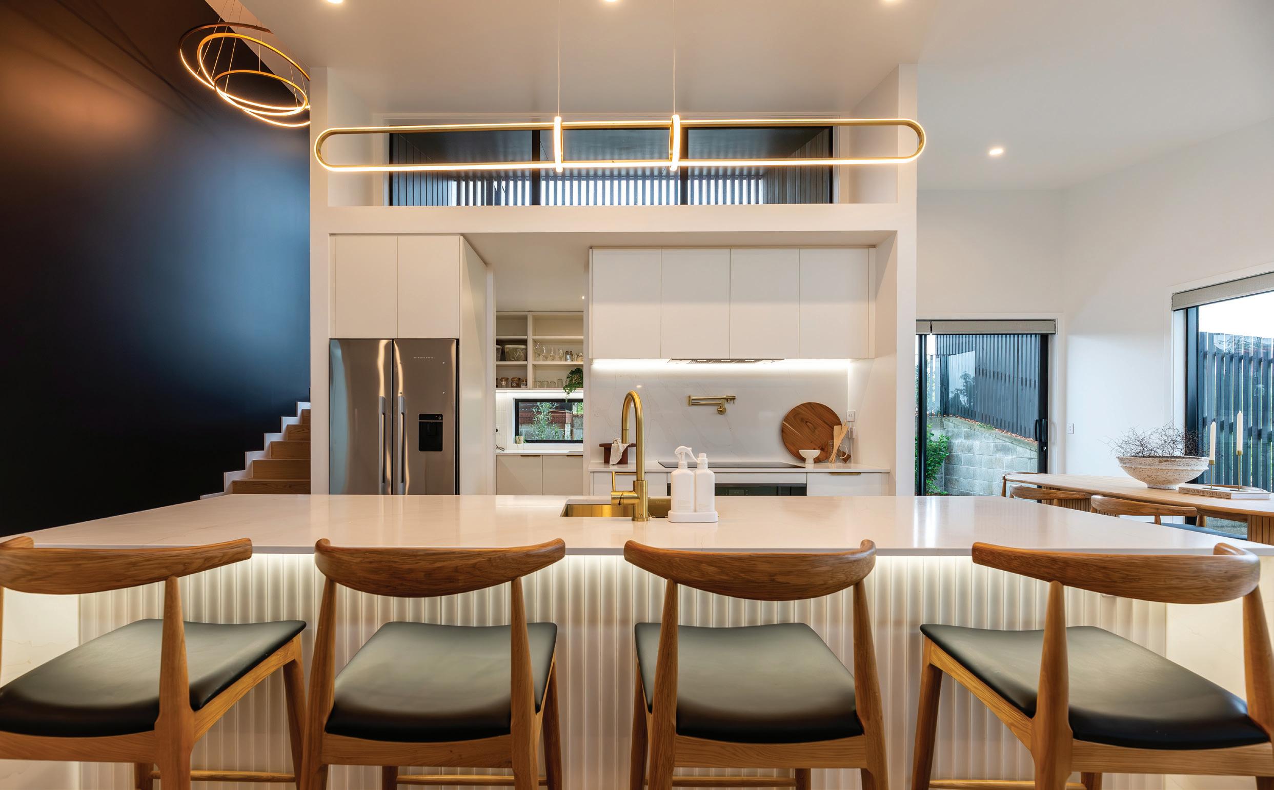 The joinery by Pacific Coast Kitchens includes the bar area, laundry and garage storage. The kitchen benchtop is Trendstone Cala Eleganza, with Melteca Warm White satin doors and panels. The beautiful fluted feature panels on the island are a painted Laminex Surround.