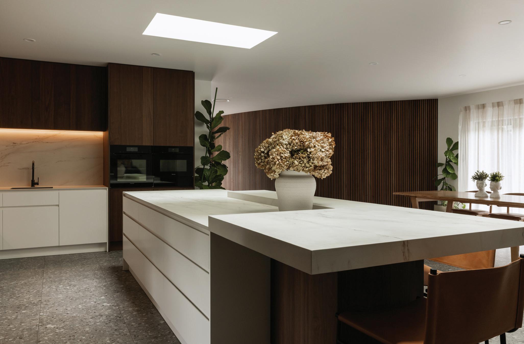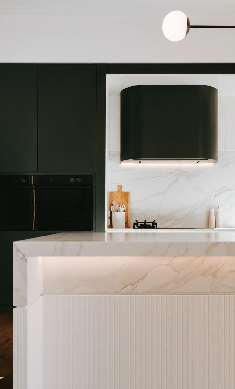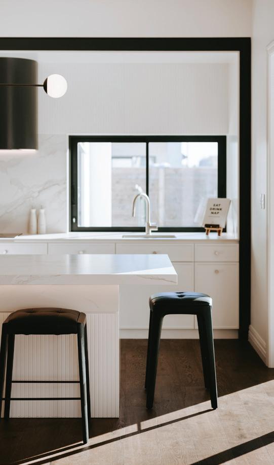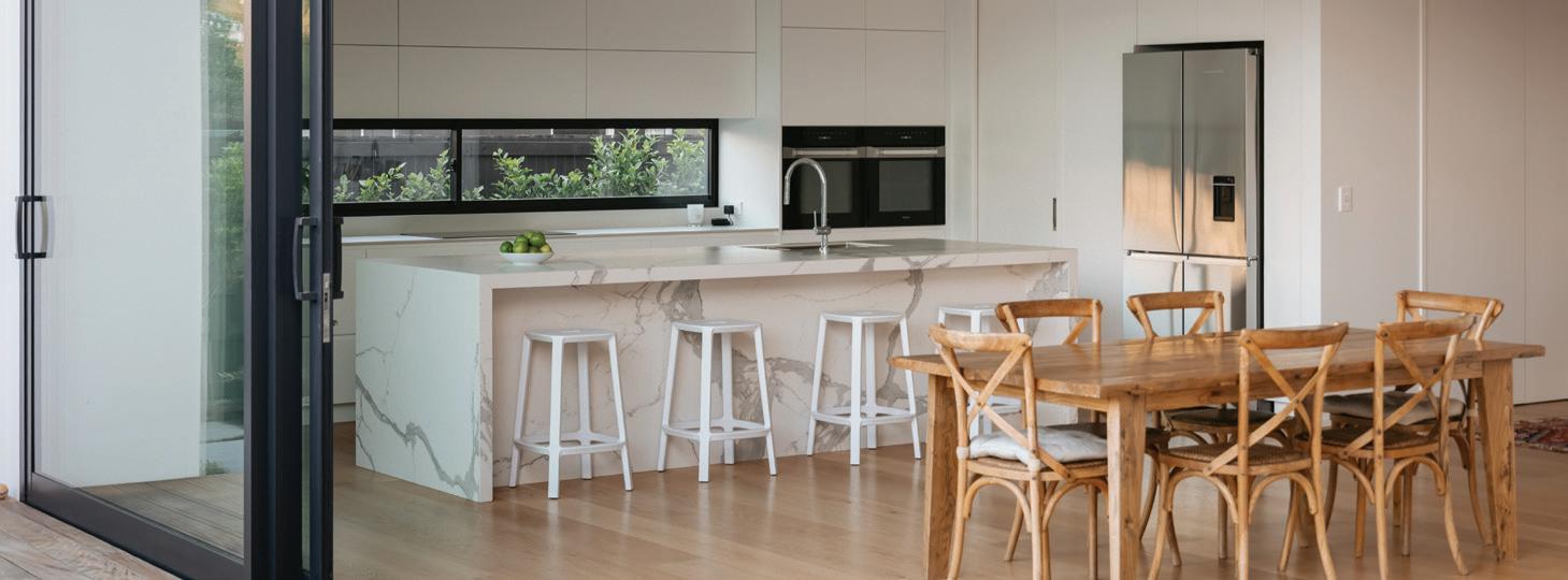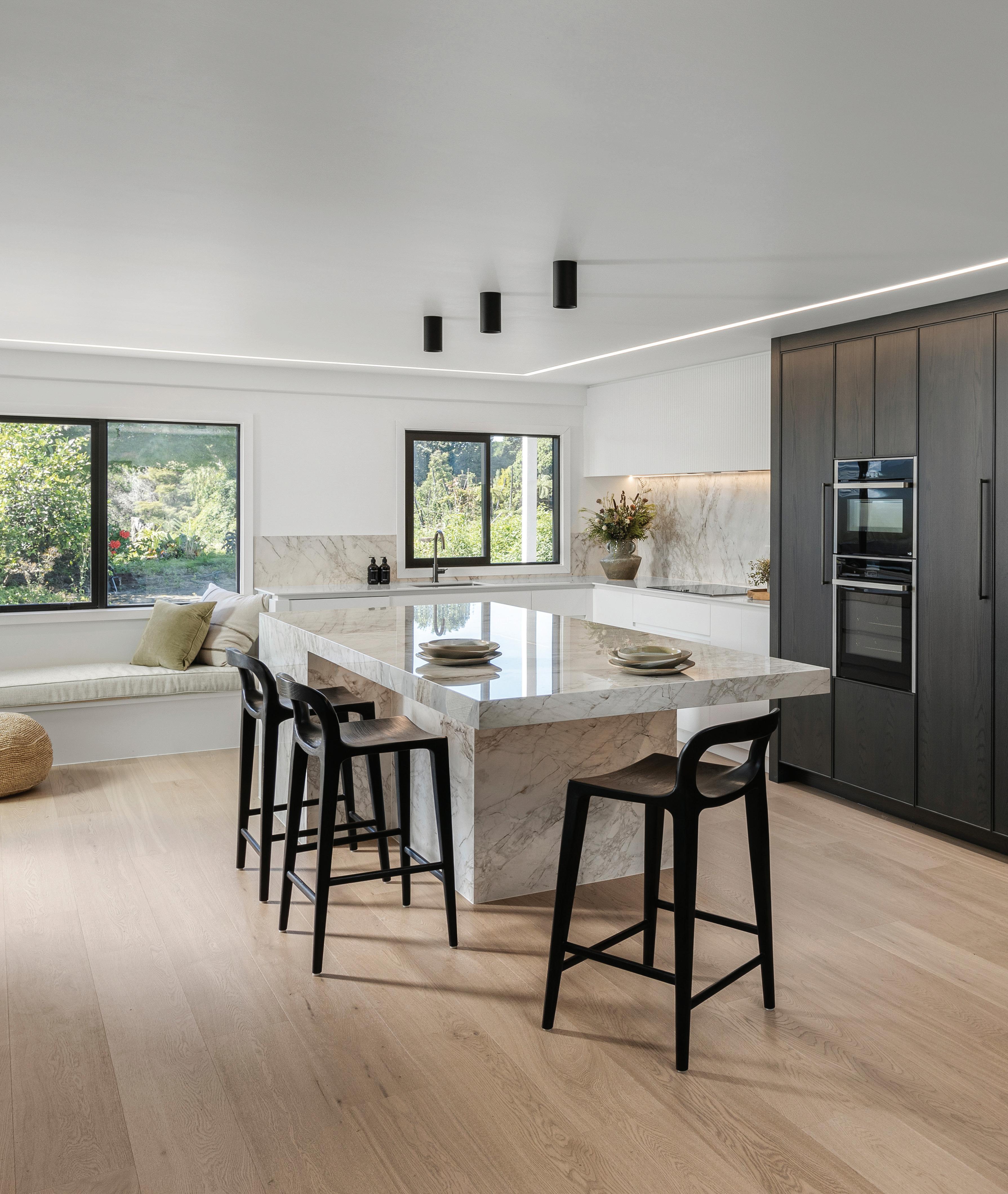The joinery by Pacific Coast Kitchens includes the bar area, laundry and garage storage. The kitchen benchtop is Trendstone Cala Eleganza, with Melteca Warm White satin doors and panels. The beautiful fluted feature panels on the island are a painted Laminex Surround.