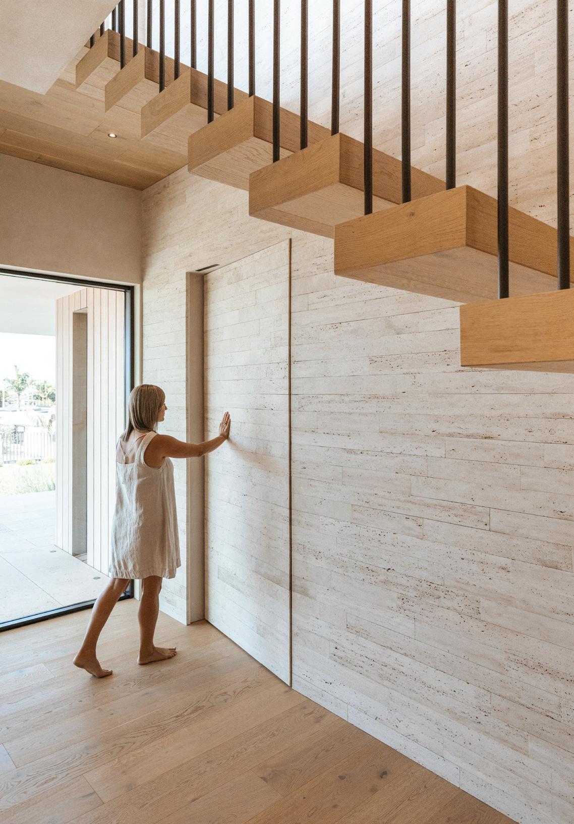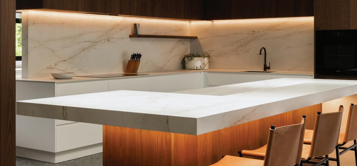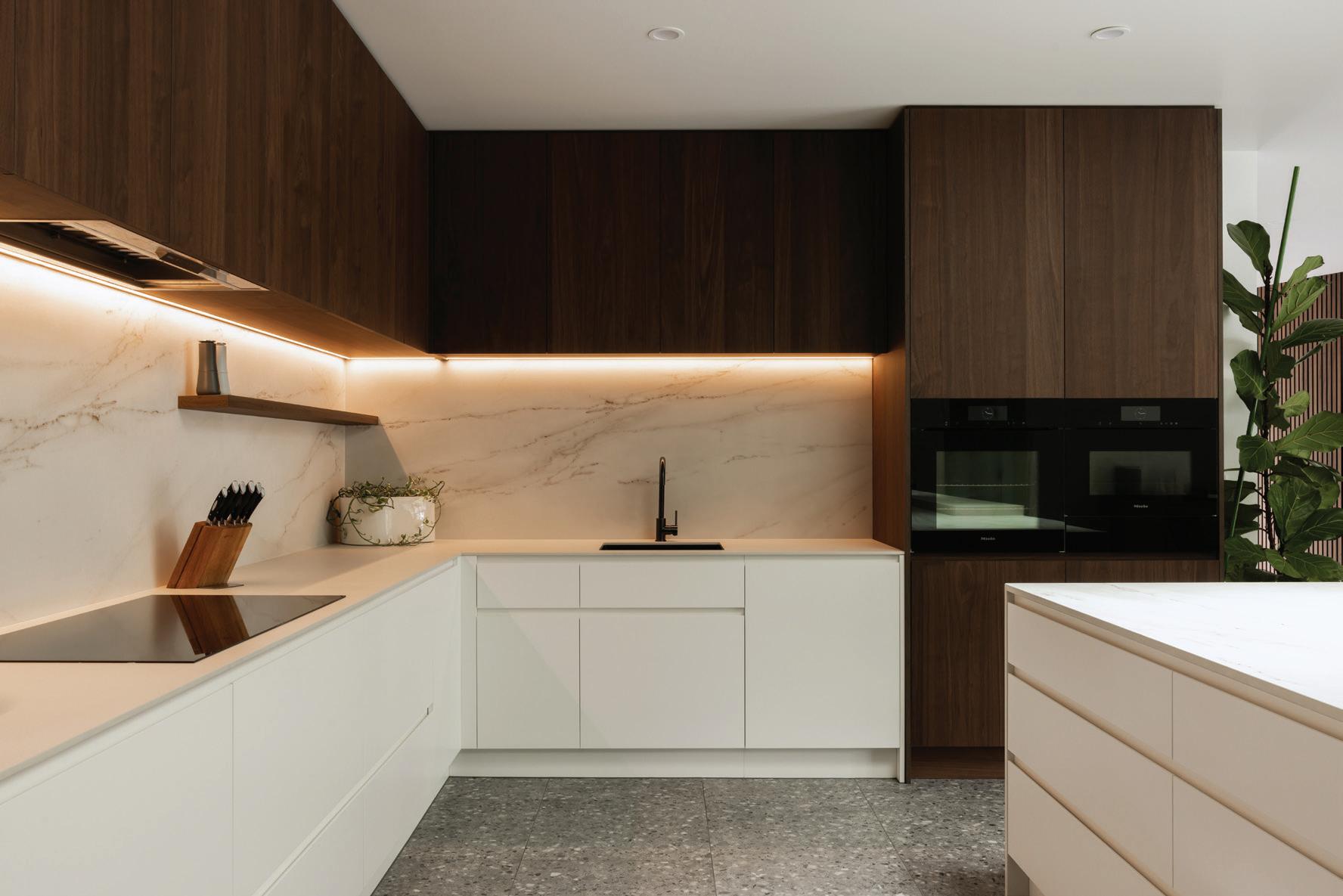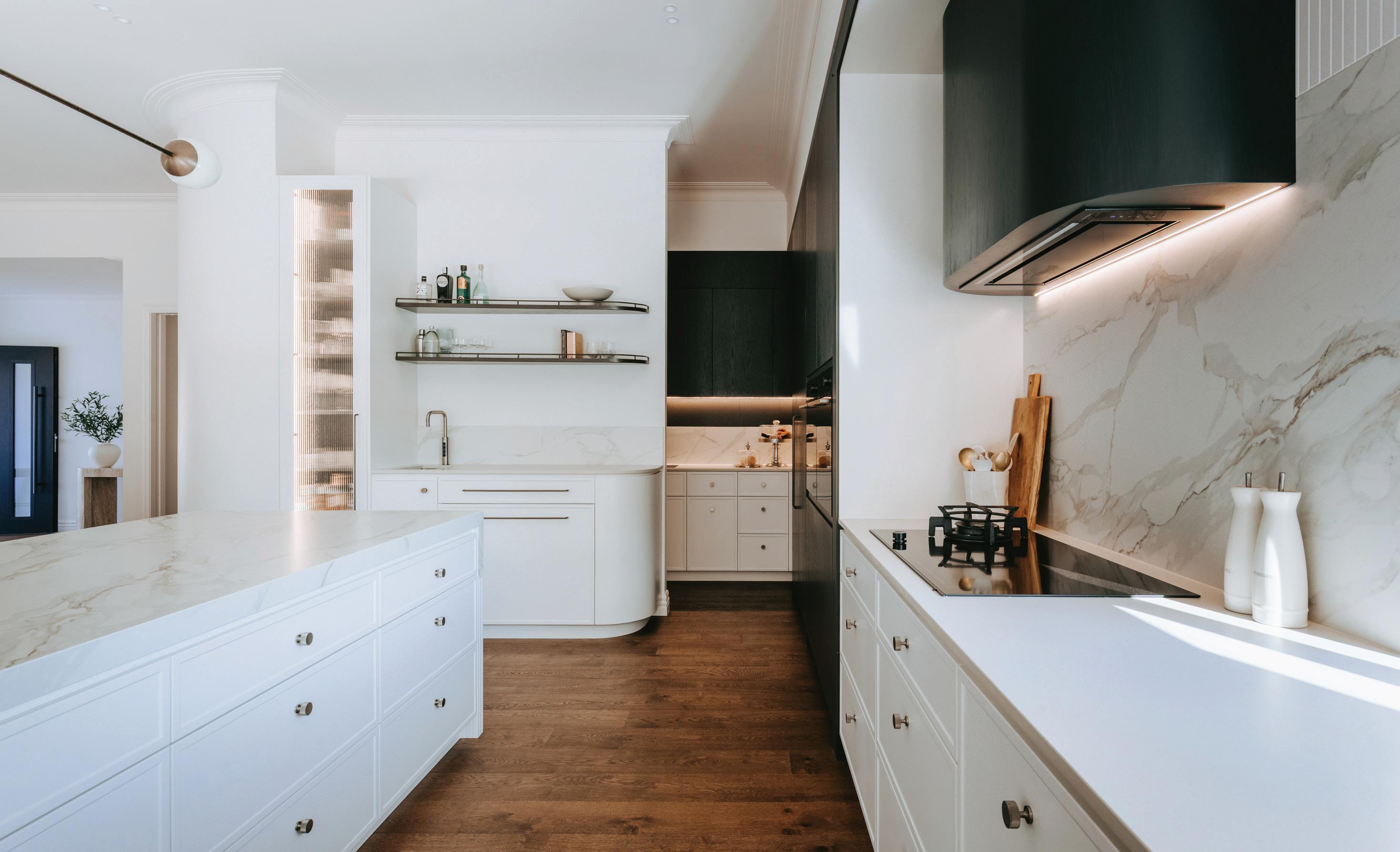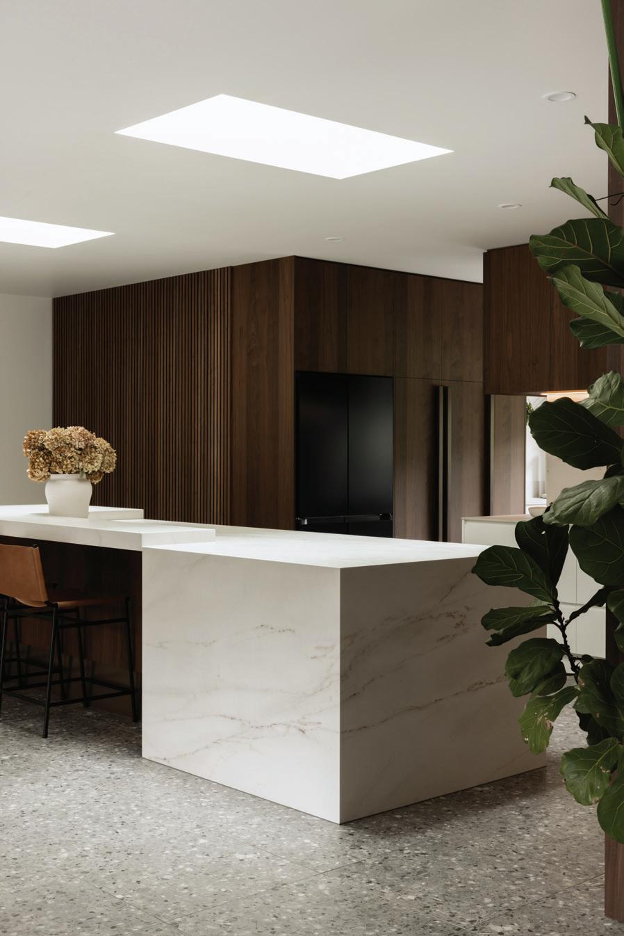 The joinery by Pacific Coast Kitchens includes the bar area, laundry and garage storage. The kitchen benchtop is Trendstone Cala Eleganza, with Melteca Warm White satin doors and panels. The beautiful fluted feature panels on the island are a painted Laminex Surround.
