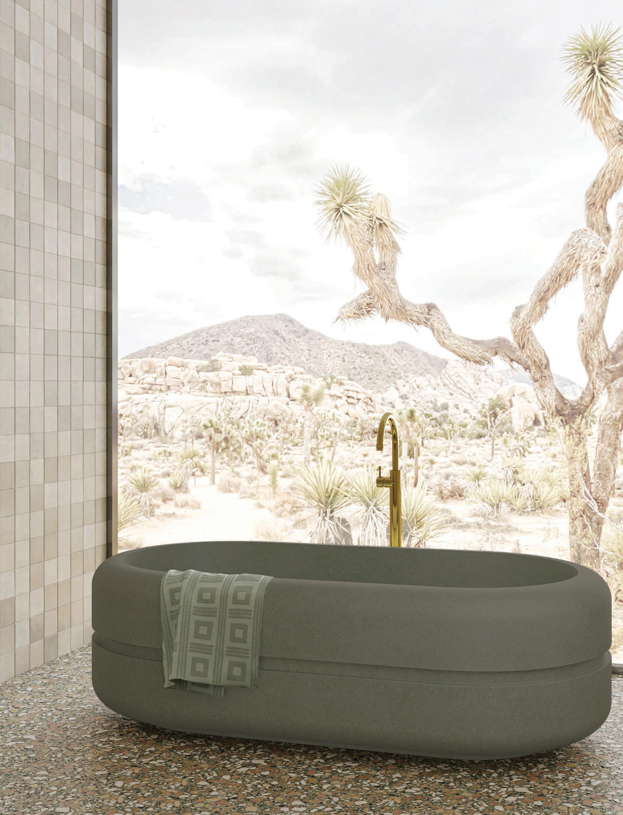 Crafted from smooth solid surface and available in seven finishes, the collection includes a freestanding bath and two basin formats: an oversized oval and a compact pill shape — both designed to elevate their surroundings.