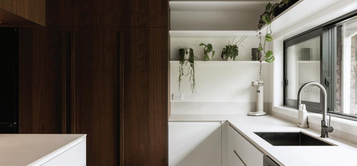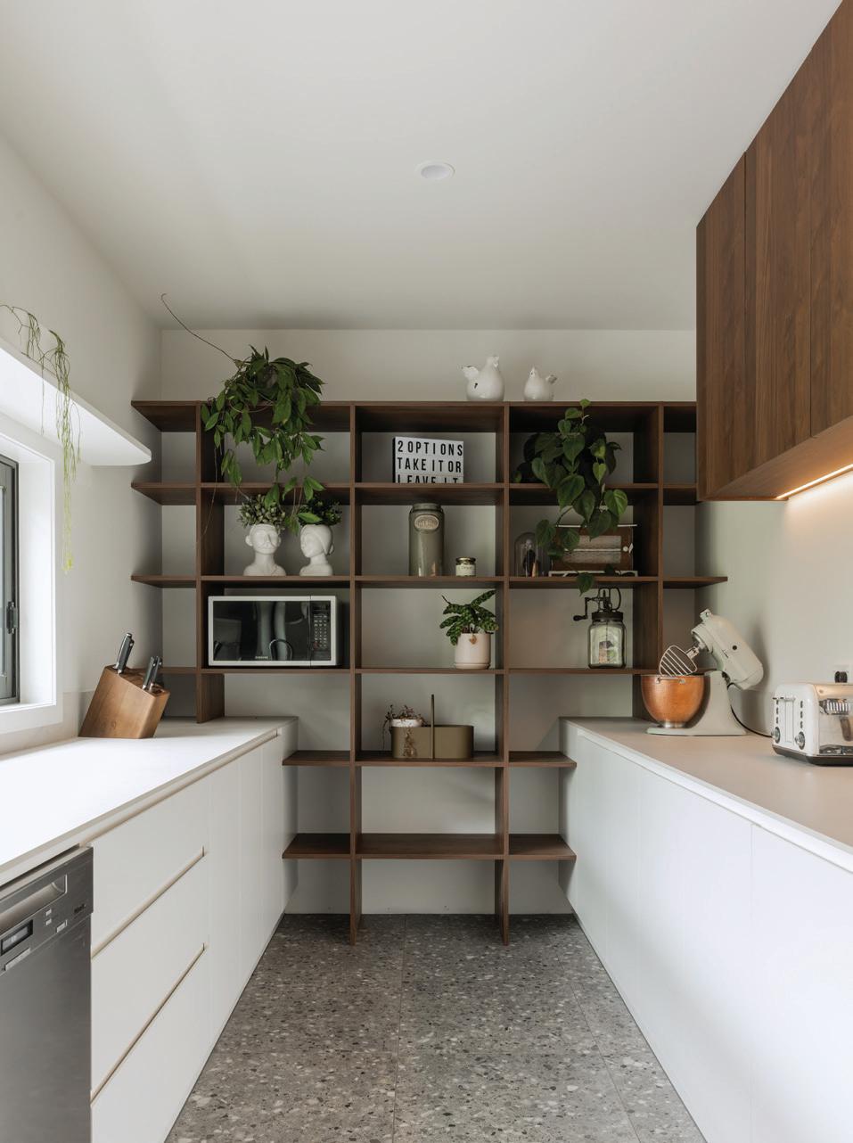 Nicola worked with homeowner Faye selecting finishes, colours, materials, lighting, cabinetry details and advising on all those big decisions needing to be made throughout the building process. The interior of the home was expertly painted by Hamish Ross Painters. White was the base colour with warmer elements of brass and Hurford’s Oak timber flooring installed by Abstract Floors to elevate the interior with softness, warmth and practicality. Colour has been used sparingly, with a soft green fluted feature wall in the primary suite and a touch of black coming in from outside in the entrance feature wall that continues down a level into the kitchen area. Shades of soft grey and taupe feature in the tiles, installed by SRL Tiling and wool carpets bring timeless neutral colour.