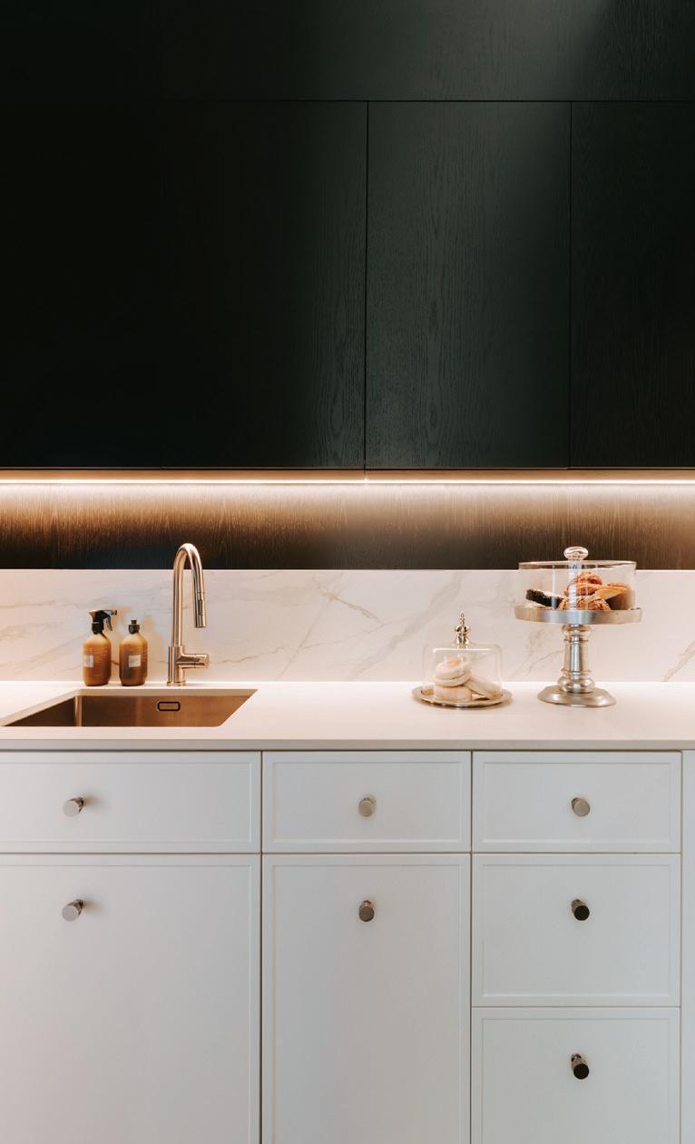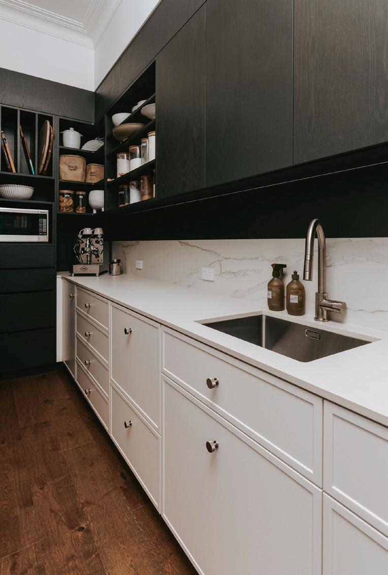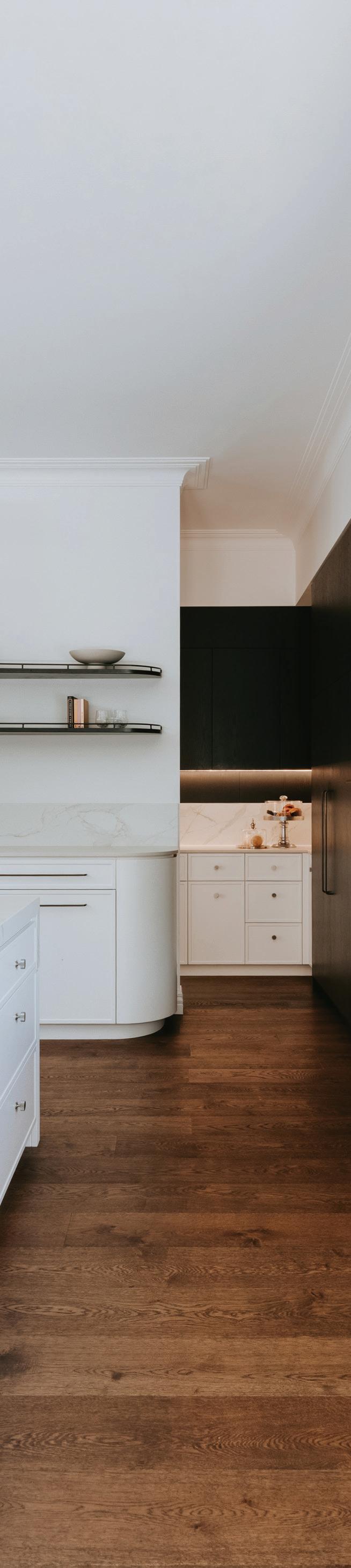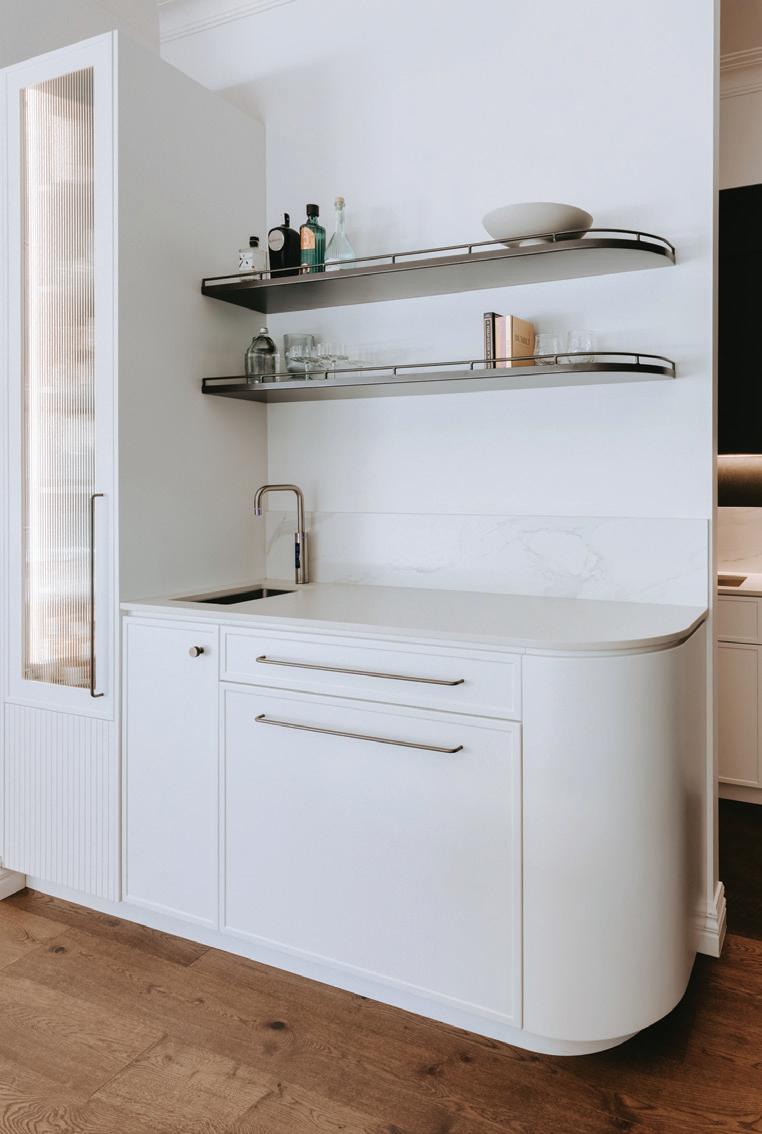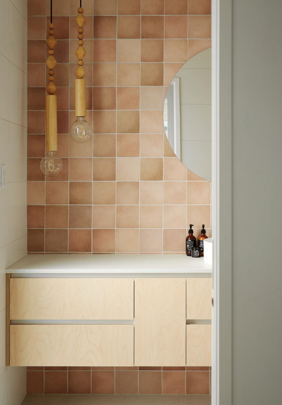 “There are a lot of subtle curves and vertical lines in this project,” says Nicola. “From light fixtures, vanities and feature walls to the tiles in the laundry and butler’s pantry. The clients wanted light and bright so we included elements of brass to bring warmth. In the laundry we added a hint of playfulness with a gorgeous blush pink tap, just something to bring a smile to the face of anyone tasked with doing the laundry.”