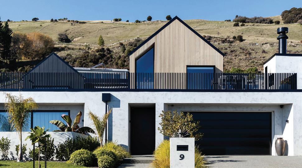 achieve something that looked like concrete panels but with a plaster finish. It hadn’t been done before, and Adam from Nelson Plaster Solutions was great to deal with and chose the two colours to blend in to look like concrete.” The home’s careful positioning ensures it takes full advantage of the breathtaking views, while “the green roof over the garage is a standout feature” says Jorgen Andersen, Director of Arthouse Architecture Ltd— an innovative solution that extends the landscape and offers a rare flat lawn in a hillside setting.