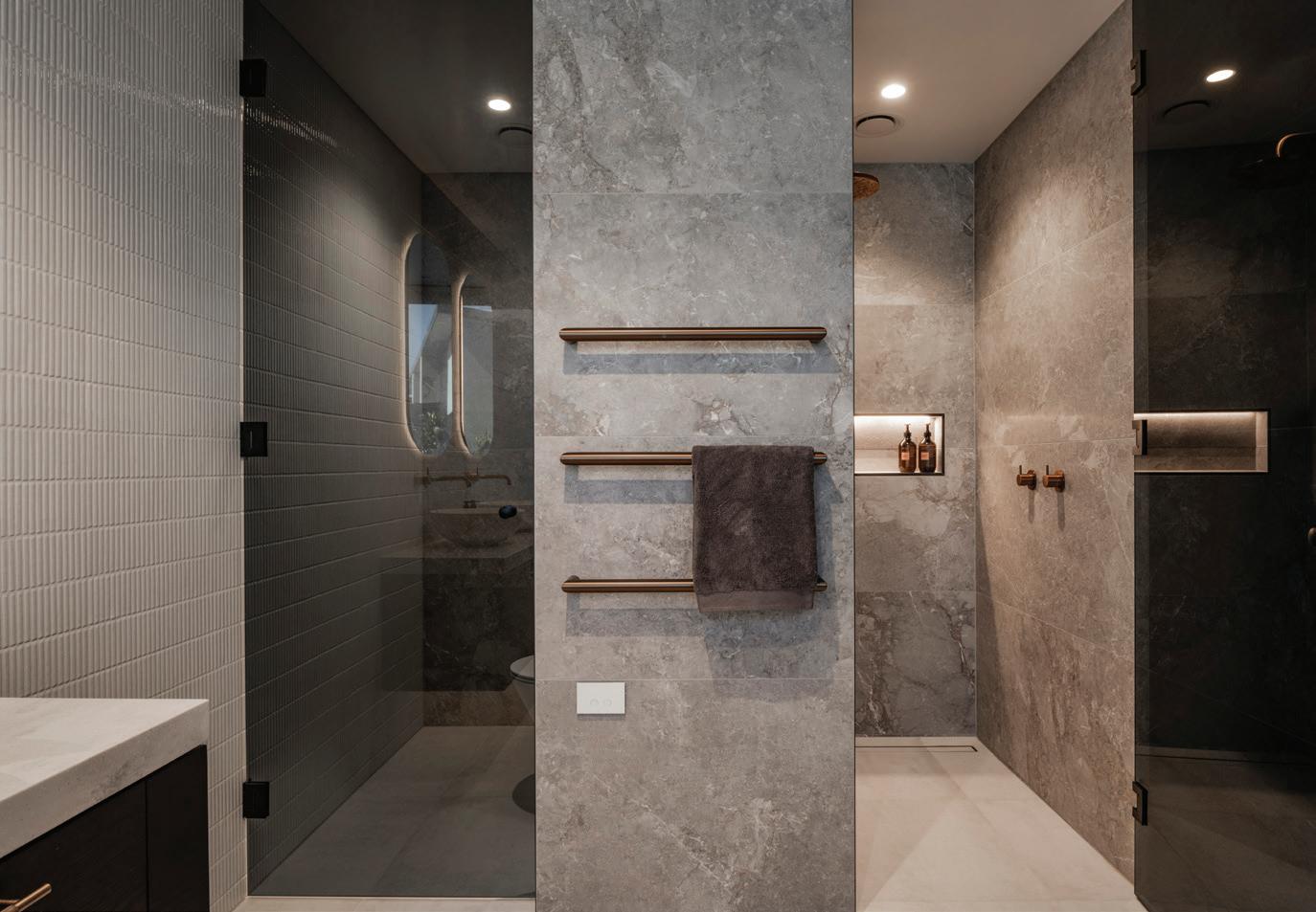 Tasman Tiling installed all the tiling across the project, with products supplied by Nelson Tile + Slate and The Flooring Room. The ensuite features Lux Carrara Polished tiles in a 600x600 format. To create cohesion throughout, 1200x600 Portofino Light Grey matt tiles were laid across the flooring, bringing a consistent and contemporary base to every space.