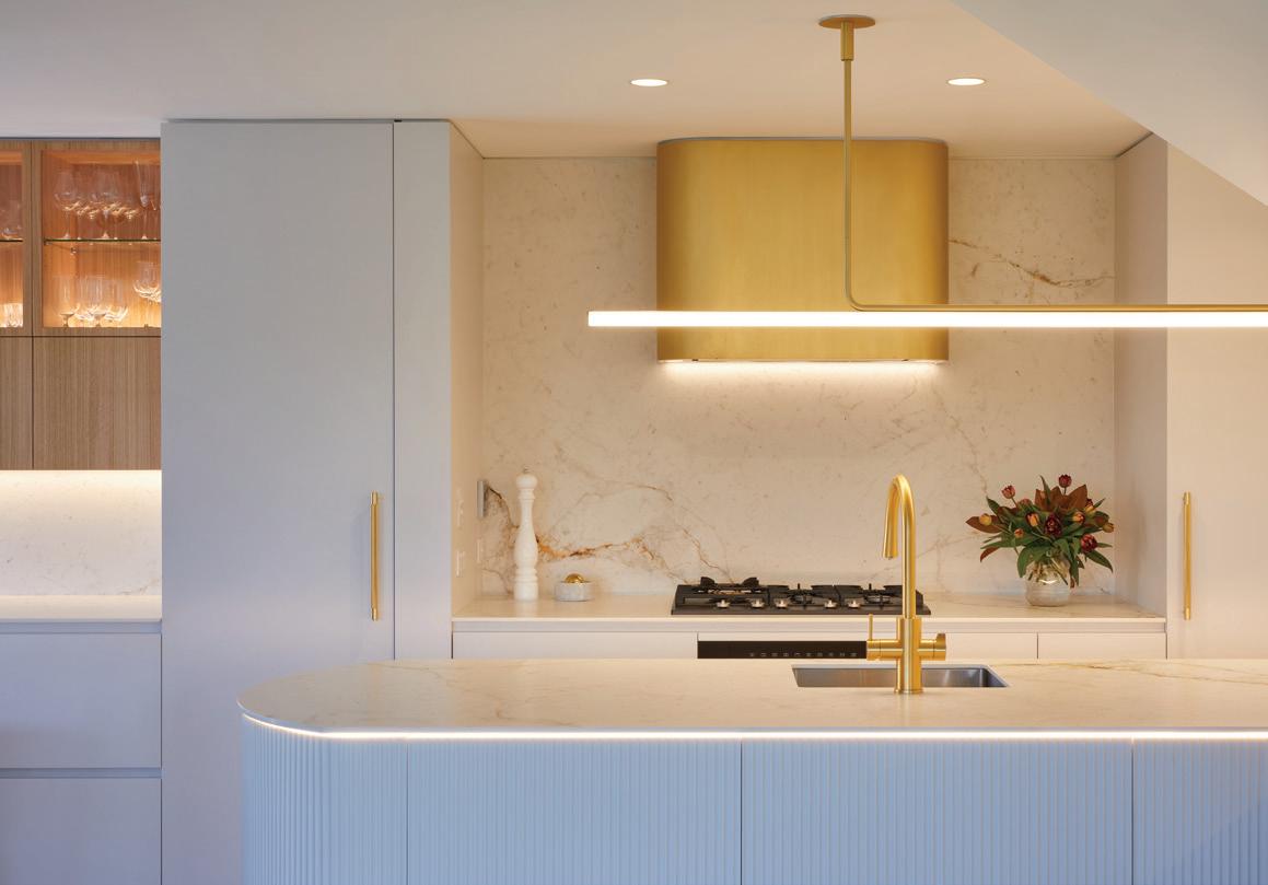 In the kitchen, refined detailing is at the centre, from a custom self-watering plant station to concealed lighting, all set beneath the home’s floating roof that defines this family collaboration.