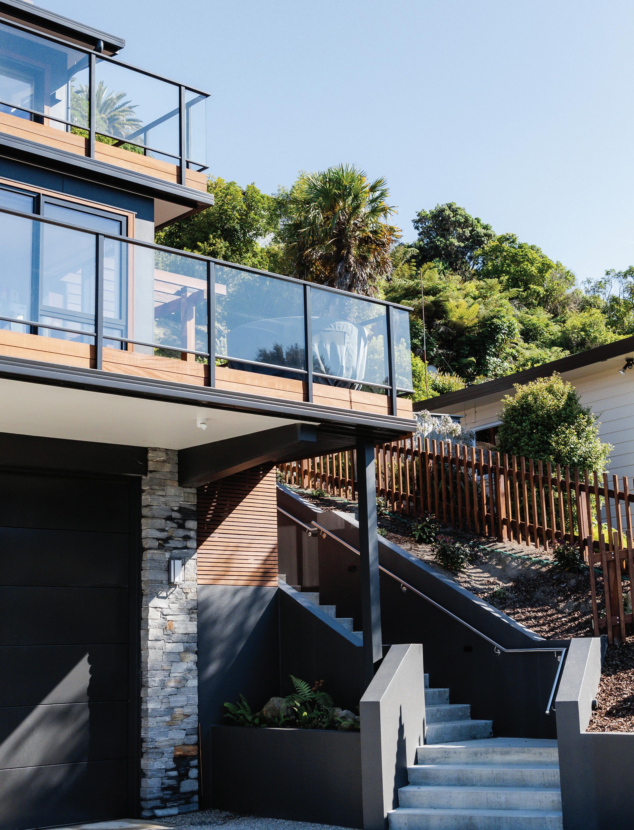 The main challenge, he adds, was the narrow and steep site. To overcome this, the team had to construct a six-metrehigh retaining wall driven six metres into the hillside. “We had to work from the top down, cutting dirt away as we worked towards the ground level before starting the house. We had to be strategic when working out this plan, as it also consisted of using hiabs to lift diggers up and down the hill to backfill the retaining wall.”