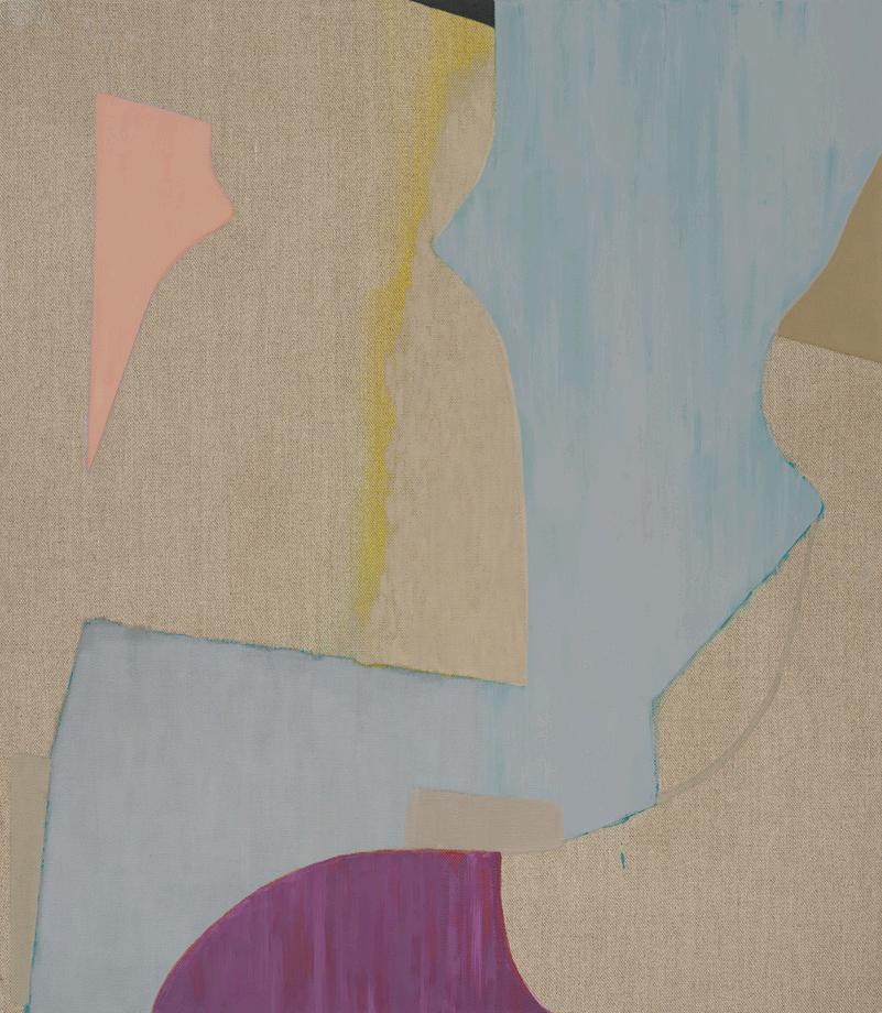 The palettes are improvised. One color impacts her choice for the next as she considers how shape, color, and the linen surface interact. For O’Brien, flat colors become both presence and void; with the right combination of colors, a single shape can become both. Lines and shapes are placed thoughtfully, connecting, defining, breaking, and enveloping each other. Both hard edges and areas of dissipating color coexist, creating a tense, evocative energy that draws the viewer in.